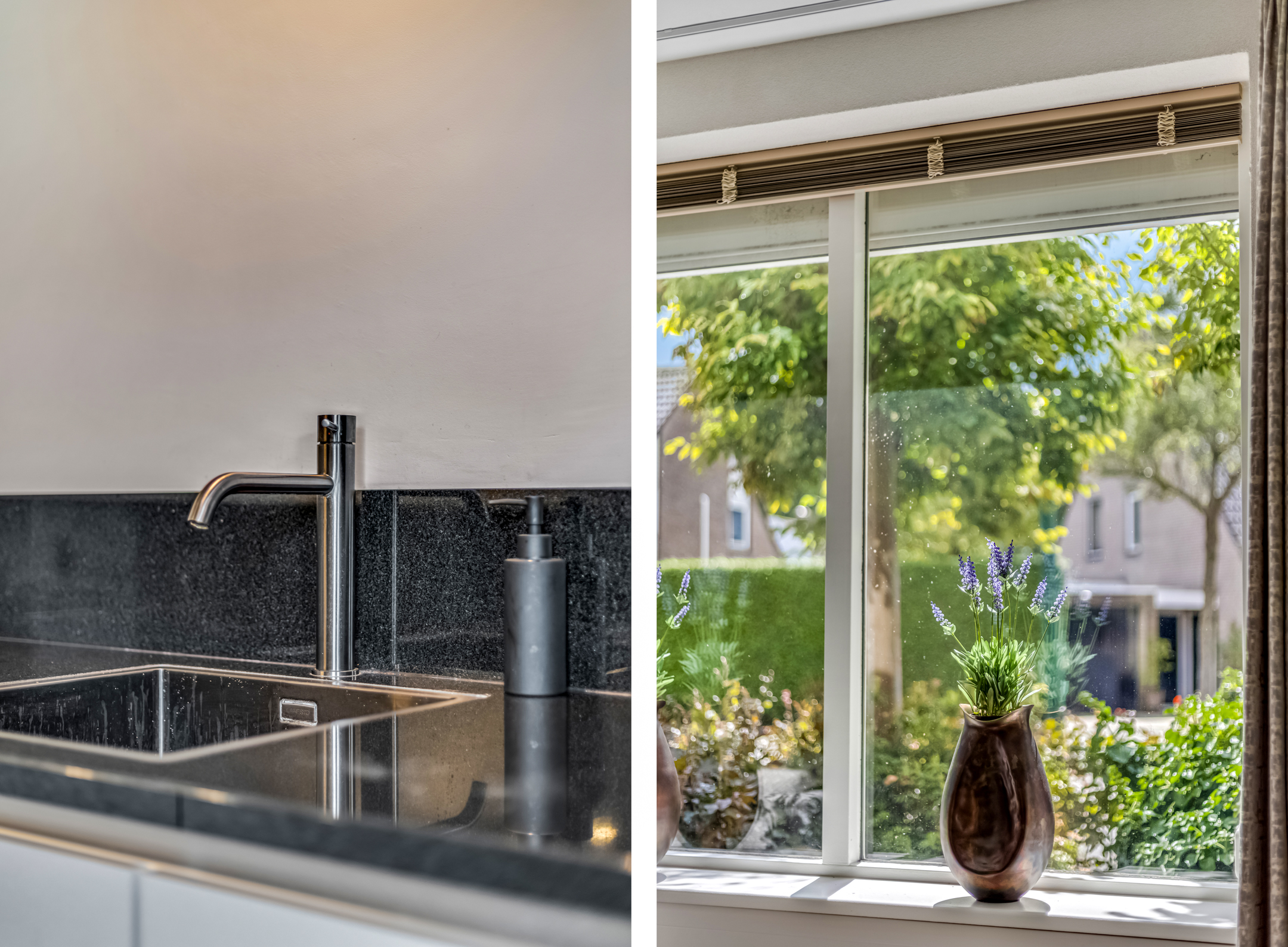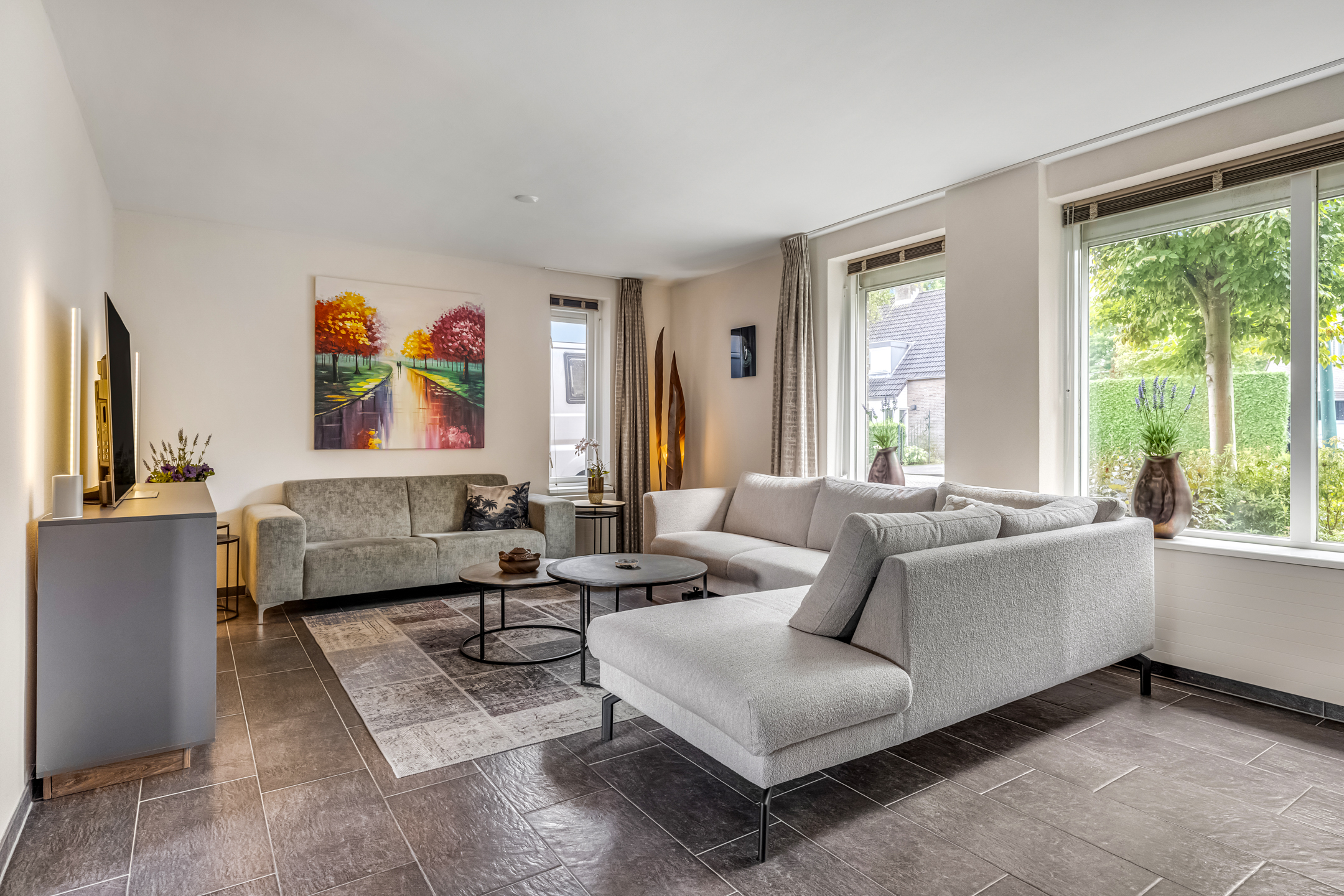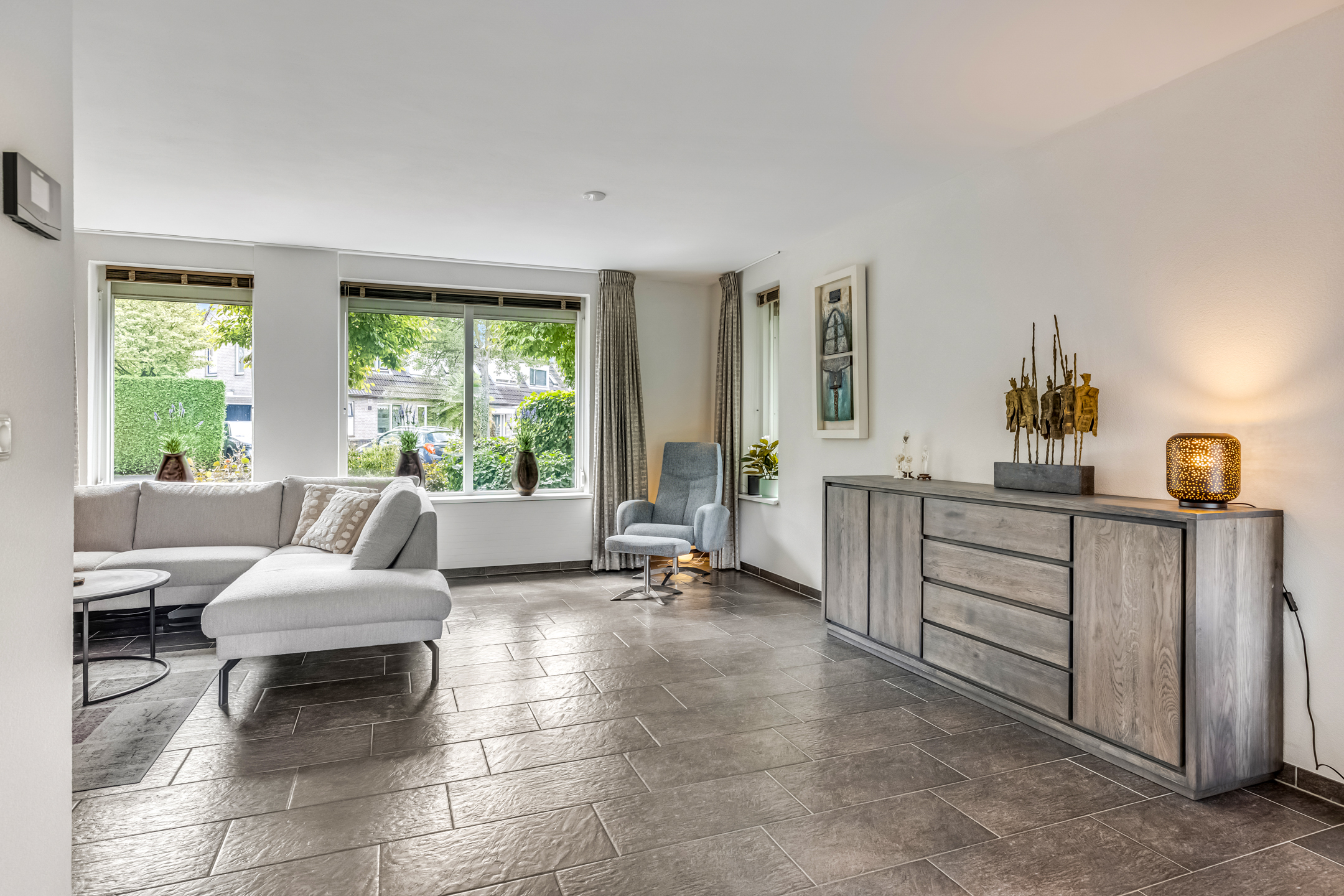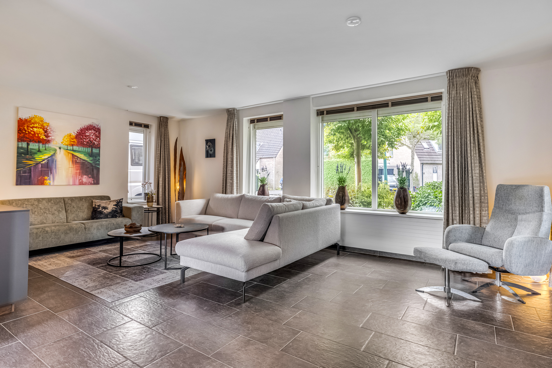 Een brede oprit aan de rechterzijde leid je naar de voordeur, ruime garage en tuin. Je komt de woning binnen in de hal. Hier vind je de trap naar de 1e verdieping, het toilet, meterkast en veel ruimte om jassen en tassen op te bergen. Vanuit de hal stap je zo de gezellige en ruime woonkamer in. Hier is plek voor een fijne zithoek. Daarnaast kun je hier met gemak een grote eettafel neerzetten, waar de hele familie aan kan zitten. Via de woonkamer loop je dankzij de schuifpui zo de tuin in. Vanuit de woonkamer kom je in de keuken. De vernieuwde moderne keuken is voorzien van een granieten blad, brede Bora inductiekookplaat met ingebouwde afzuiging, combi-magnetron, vaatwasser en een koel-vriezer van het merk AEG. Via de keuken heb je een doorloop naar de bijkeuken en de inpandige garage. In de bijkeuken tref je de aansluiting voor de wasmachine en de droger en de Vaillant CV-ketel uit 2021. De garage met vernieuwd dak is ruim en voorzien van een elektrische deur. Via de openslaande deur in de bijkeuken kun je naar achtertuin. Rondom de woning ligt een keurig aangelegde tuin. Er is veel groen, maar er zijn ook meerdere terrassen, zodat je hier op veel plekken kan genieten van deze fijne tuin en de zon. Achter in de tuin staat een tuinhuisje waar je alle tuinspullen in kan opbergen. Gehele begane grond van de woning is voorzien van rolluiken en stucwerk op muren en plafond.