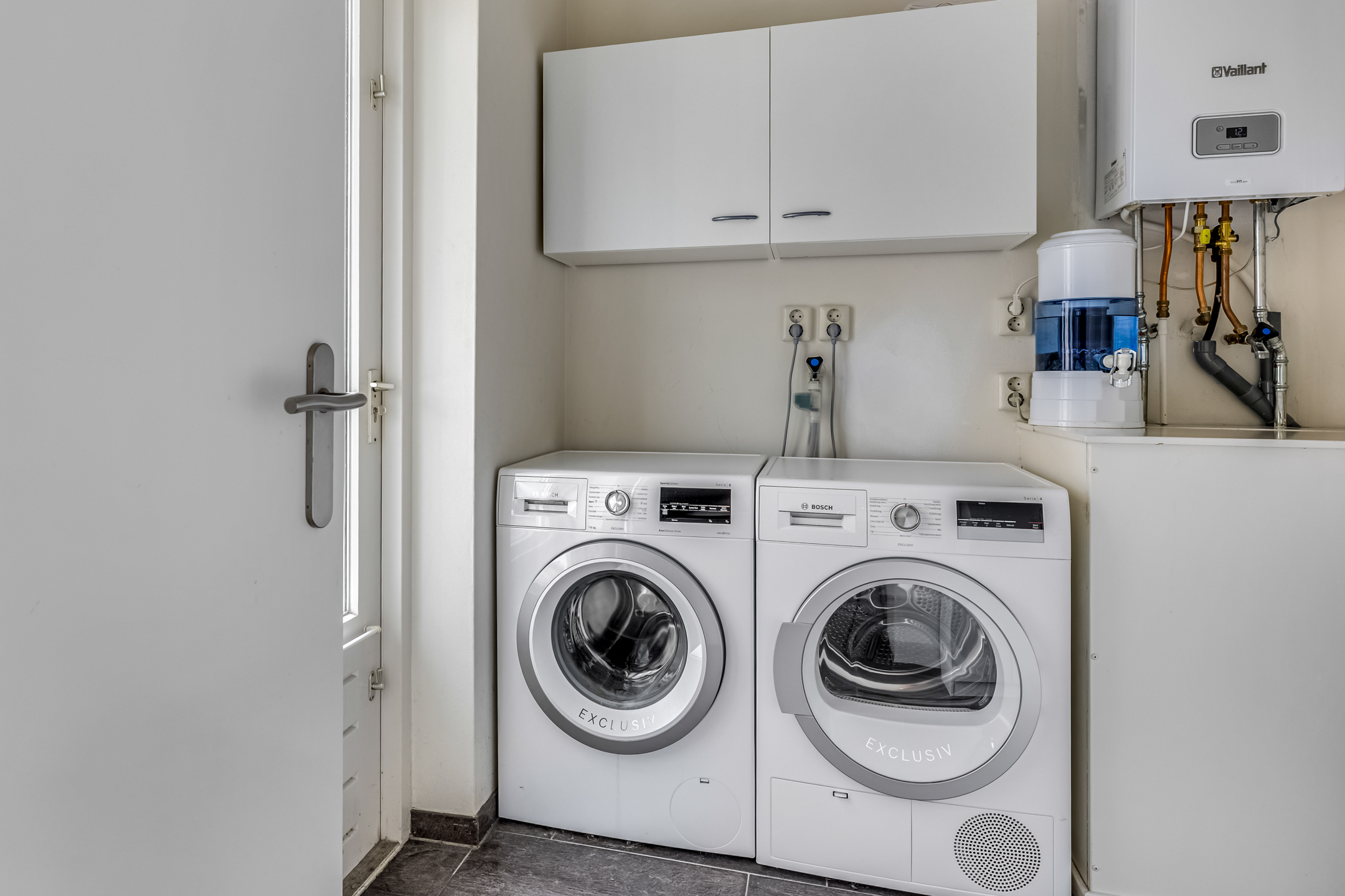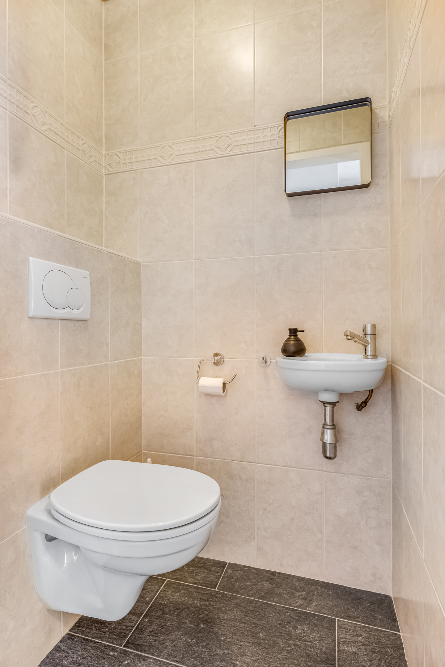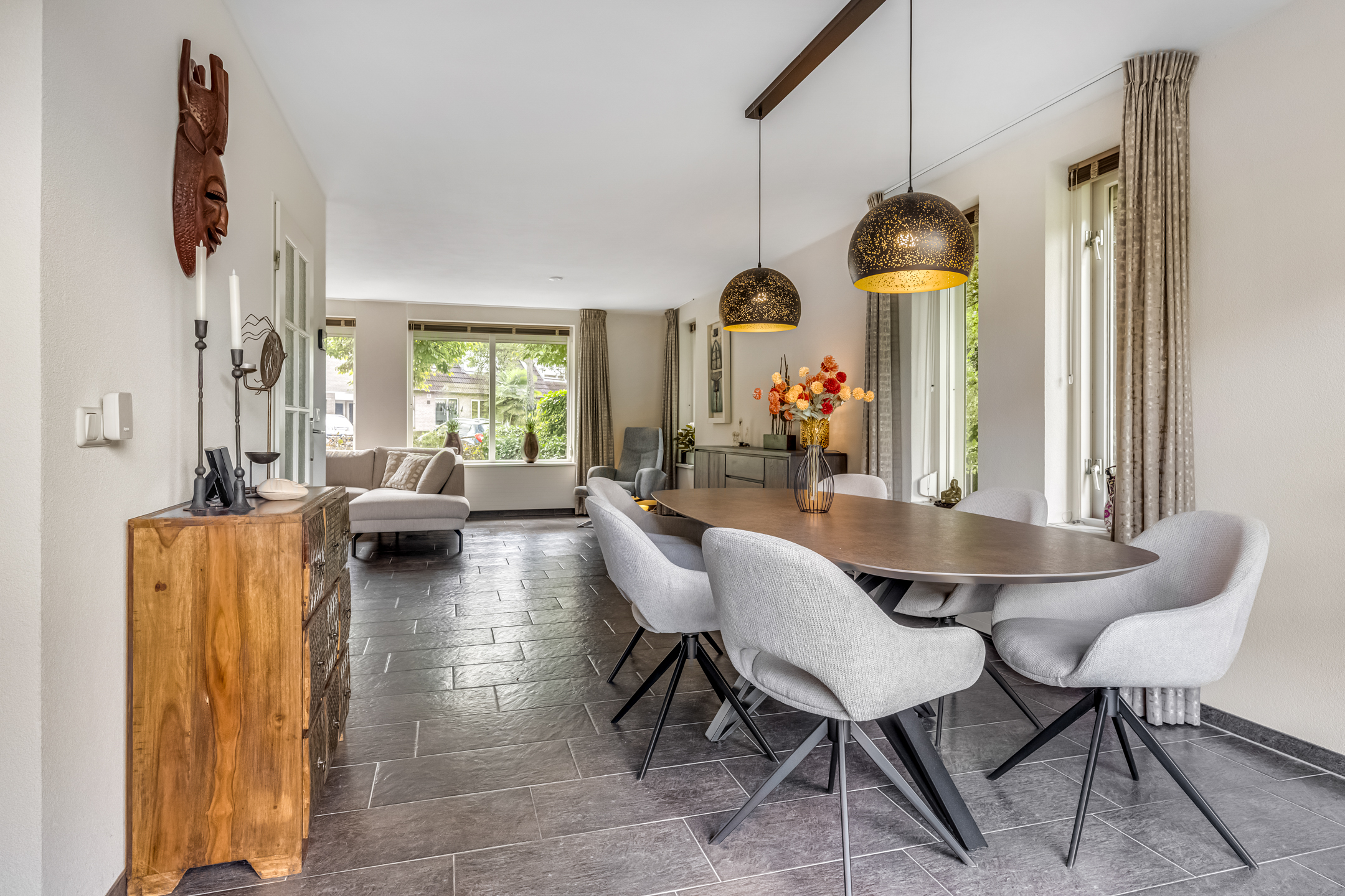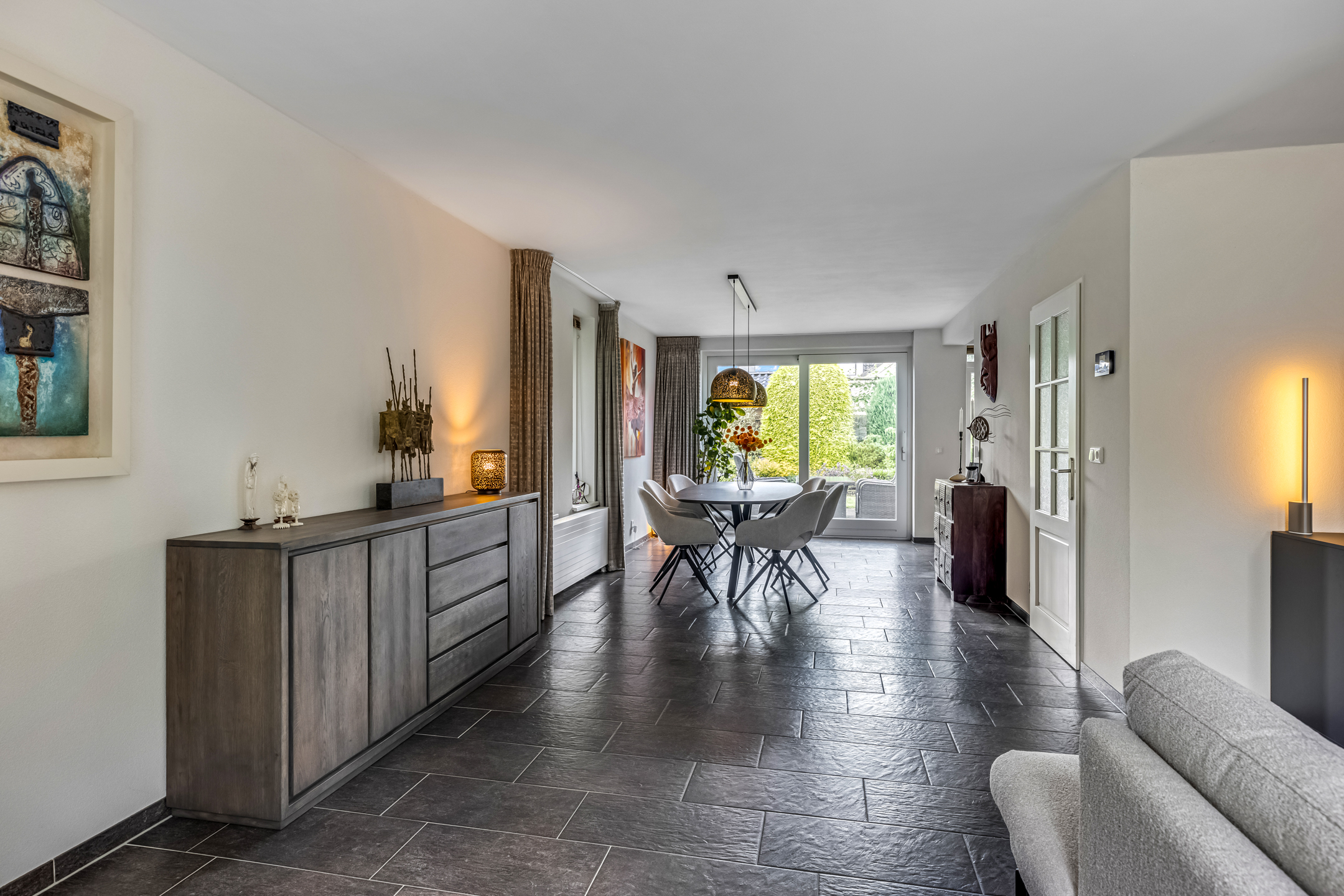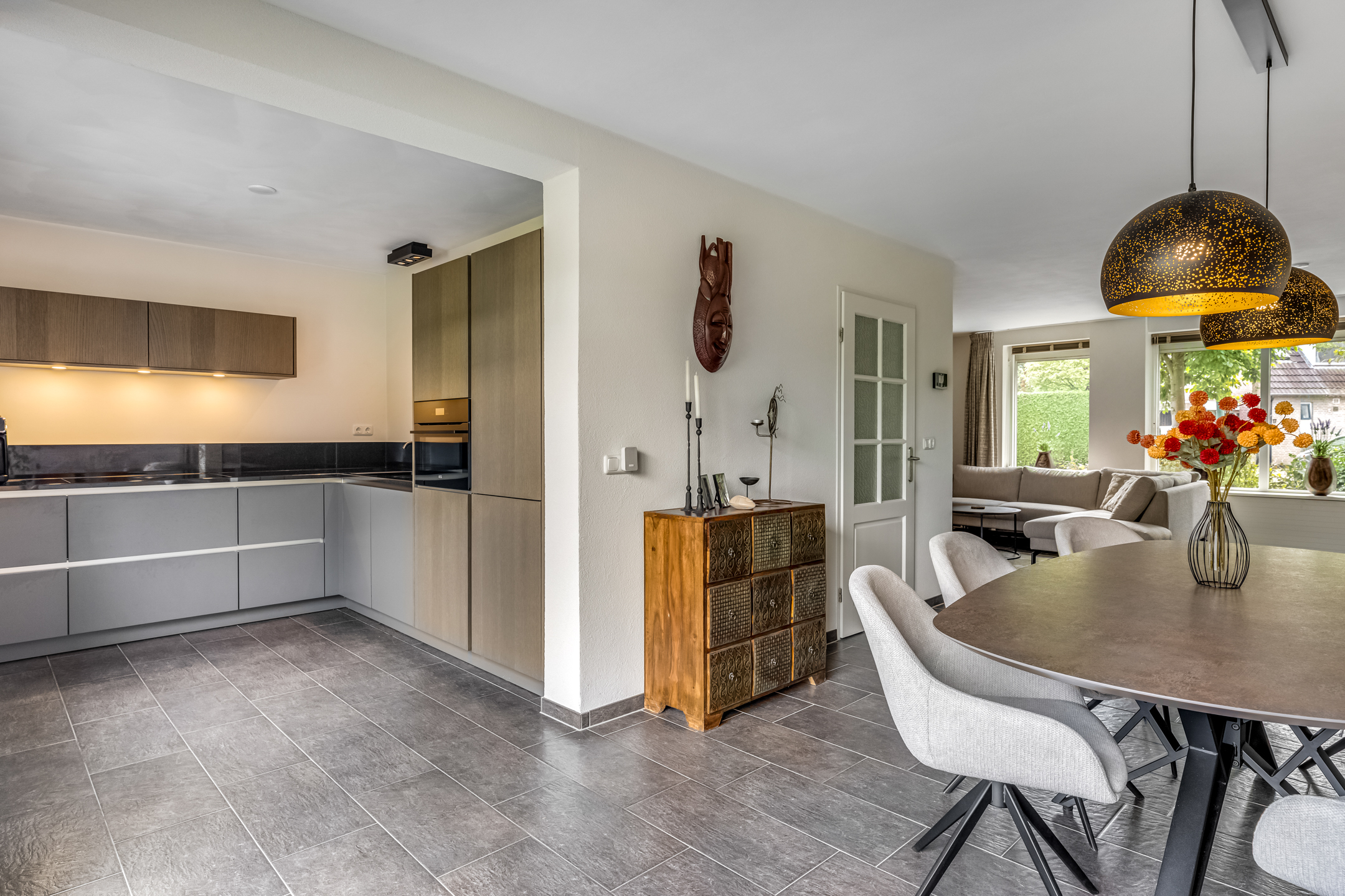 Een brede oprit aan de rechterzijde leid je naar de voordeur, ruime garage en tuin. Je komt de woning binnen in de hal. Hier vind je de trap naar de 1e verdieping, het toilet, meterkast en veel ruimte om jassen en tassen op te bergen. Vanuit de hal stap je zo de gezellige en ruime woonkamer in. Hier is plek voor een fijne zithoek. Daarnaast kun je hier met gemak een grote eettafel neerzetten, waar de hele familie aan kan zitten. Via de woonkamer loop je dankzij de schuifpui zo de tuin in. Vanuit de woonkamer kom je in de keuken. De vernieuwde moderne keuken is voorzien van een granieten blad, brede Bora inductiekookplaat met ingebouwde afzuiging, combi-magnetron, vaatwasser en een koel-vriezer van het merk AEG. Via de keuken heb je een doorloop naar de bijkeuken en de inpandige garage. In de bijkeuken tref je de aansluiting voor de wasmachine en de droger en de Vaillant CV-ketel uit 2021. De garage met vernieuwd dak is ruim en voorzien van een elektrische deur. Via de openslaande deur in de bijkeuken kun je naar achtertuin. Rondom de woning ligt een keurig aangelegde tuin. Er is veel groen, maar er zijn ook meerdere terrassen, zodat je hier op veel plekken kan genieten van deze fijne tuin en de zon. Achter in de tuin staat een tuinhuisje waar je alle tuinspullen in kan opbergen. Gehele begane grond van de woning is voorzien van rolluiken en stucwerk op muren en plafond.