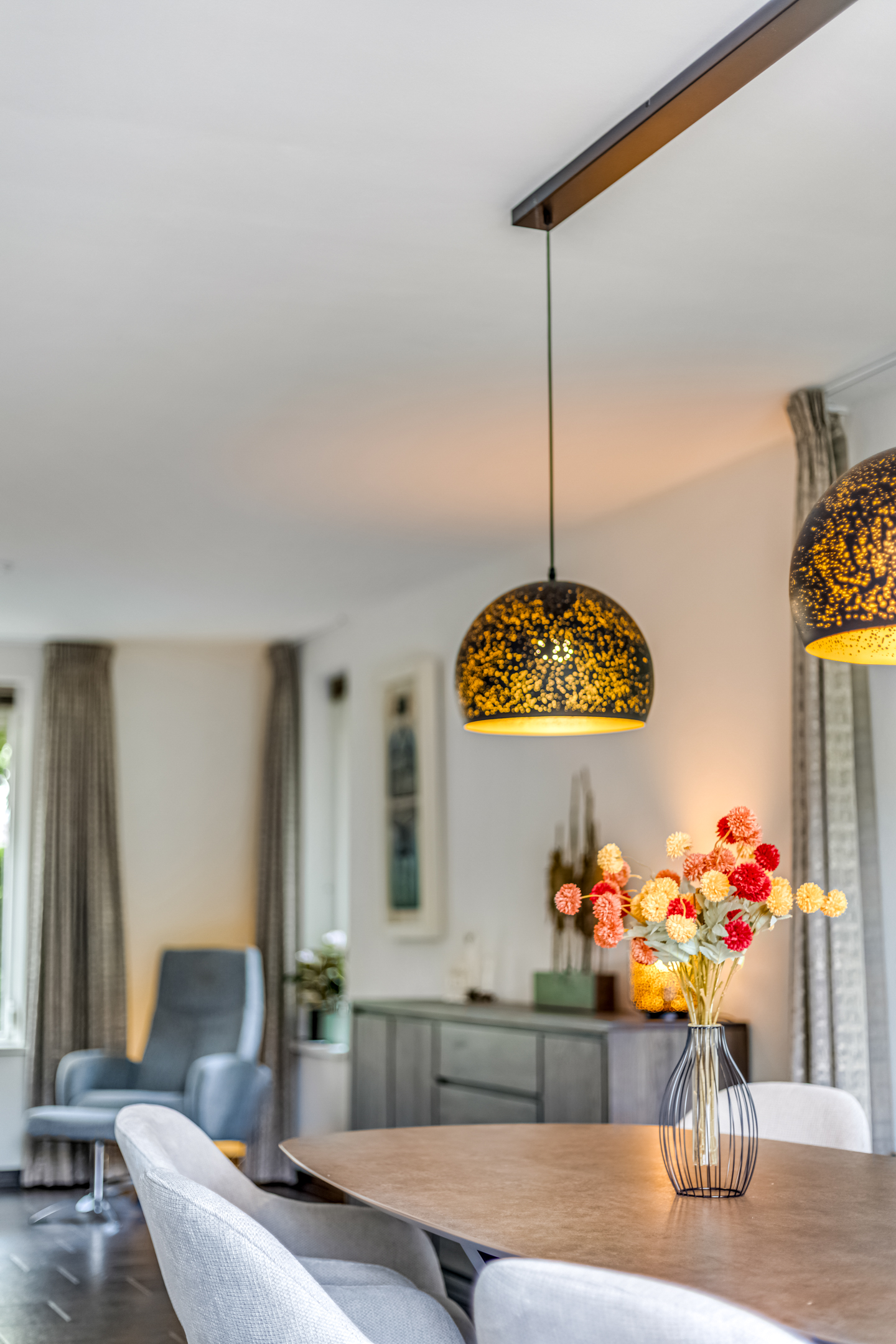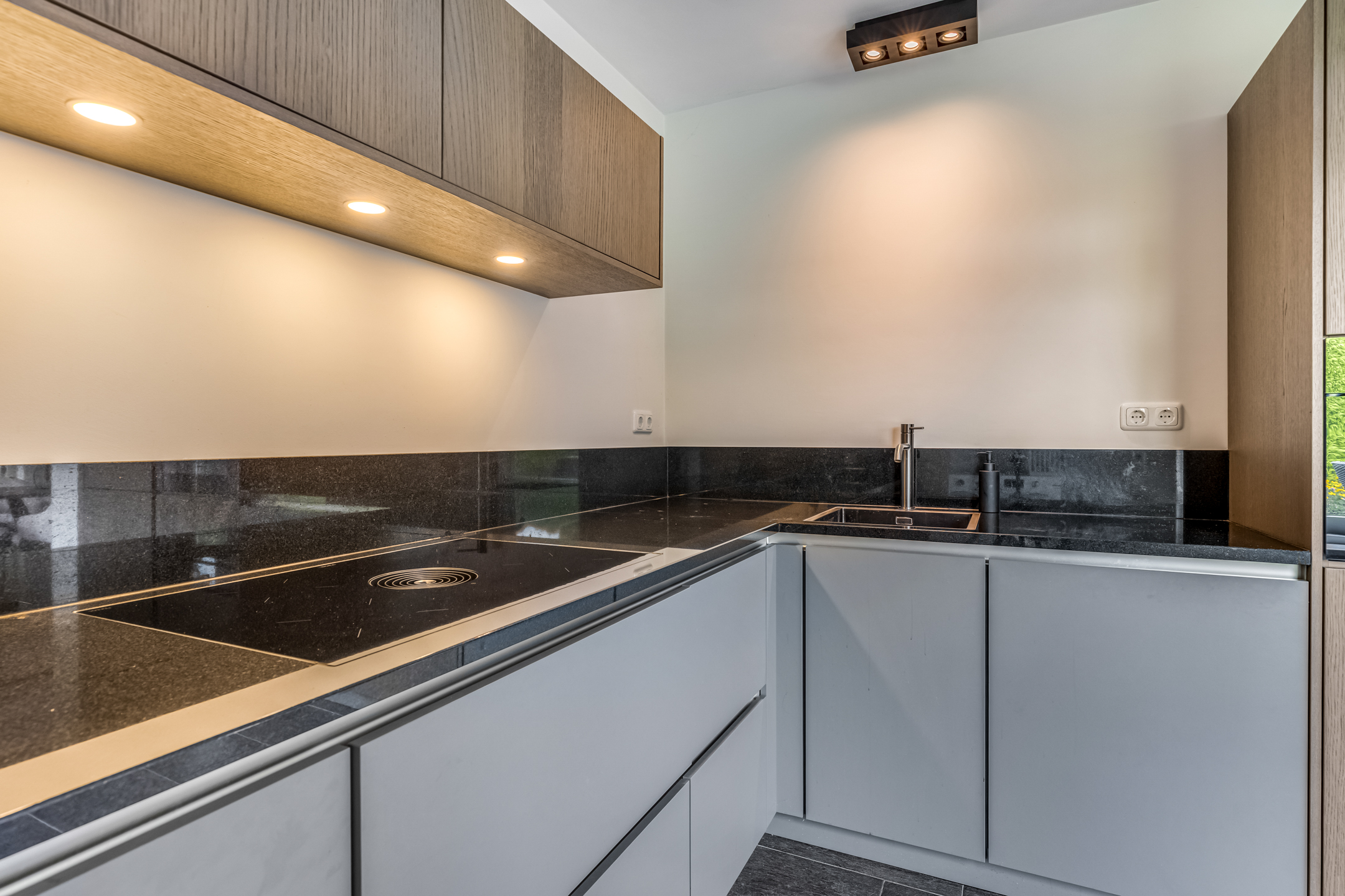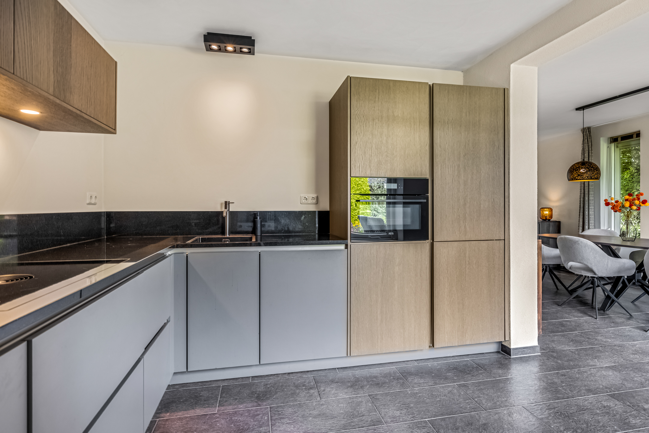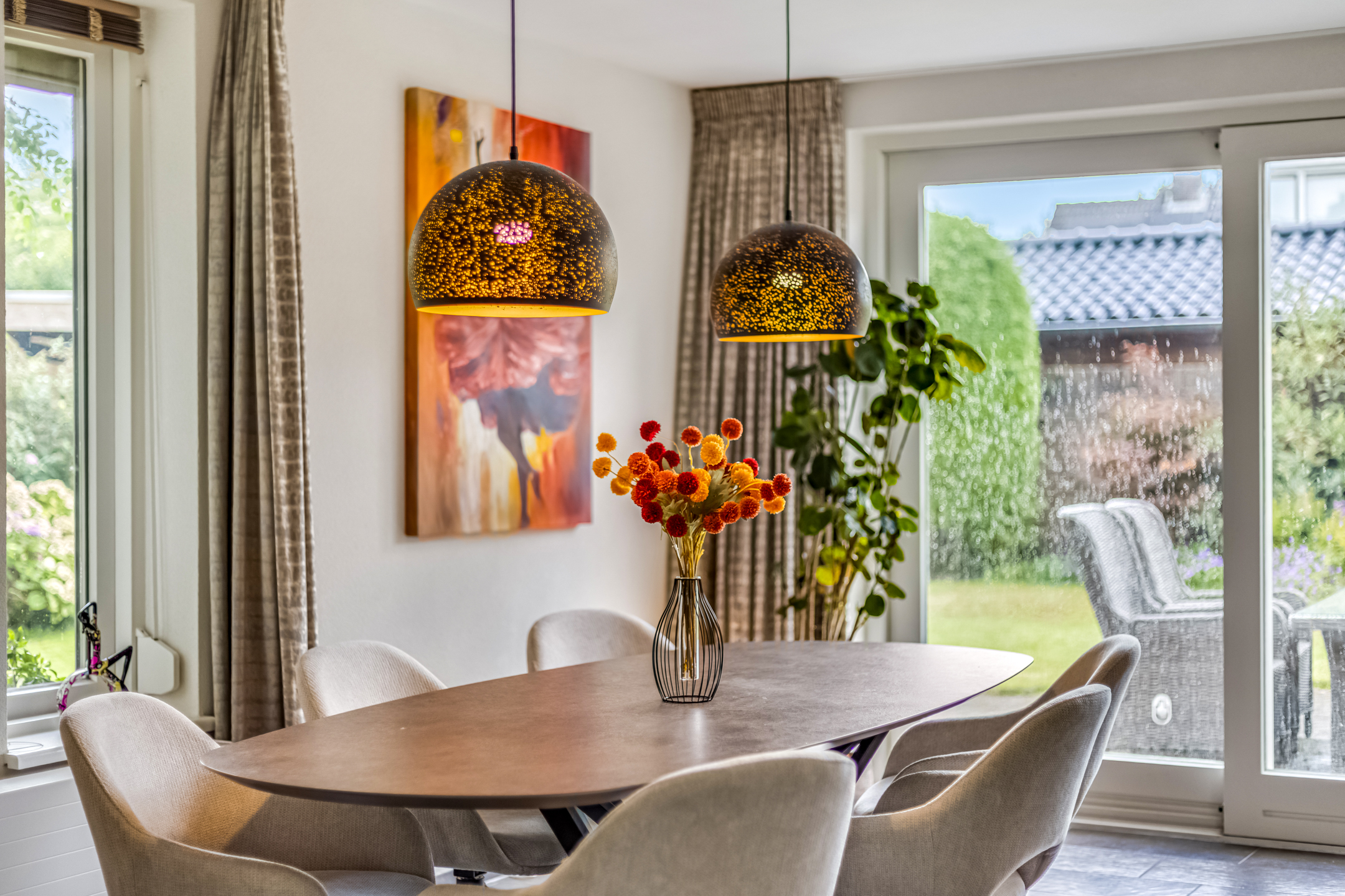 Een brede oprit aan de rechterzijde leid je naar de voordeur, ruime garage en tuin. Je komt de woning binnen in de hal. Hier vind je de trap naar de 1e verdieping, het toilet, meterkast en veel ruimte om jassen en tassen op te bergen. Vanuit de hal stap je zo de gezellige en ruime woonkamer in. Hier is plek voor een fijne zithoek. Daarnaast kun je hier met gemak een grote eettafel neerzetten, waar de hele familie aan kan zitten. Via de woonkamer loop je dankzij de schuifpui zo de tuin in. Vanuit de woonkamer kom je in de keuken. De vernieuwde moderne keuken is voorzien van een granieten blad, brede Bora inductiekookplaat met ingebouwde afzuiging, combi-magnetron, vaatwasser en een koel-vriezer van het merk AEG. Via de keuken heb je een doorloop naar de bijkeuken en de inpandige garage. In de bijkeuken tref je de aansluiting voor de wasmachine en de droger en de Vaillant CV-ketel uit 2021. De garage met vernieuwd dak is ruim en voorzien van een elektrische deur. Via de openslaande deur in de bijkeuken kun je naar achtertuin. Rondom de woning ligt een keurig aangelegde tuin. Er is veel groen, maar er zijn ook meerdere terrassen, zodat je hier op veel plekken kan genieten van deze fijne tuin en de zon. Achter in de tuin staat een tuinhuisje waar je alle tuinspullen in kan opbergen. Gehele begane grond van de woning is voorzien van rolluiken en stucwerk op muren en plafond.