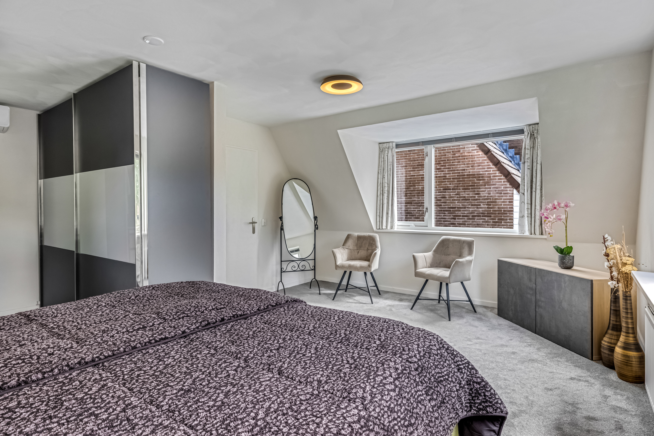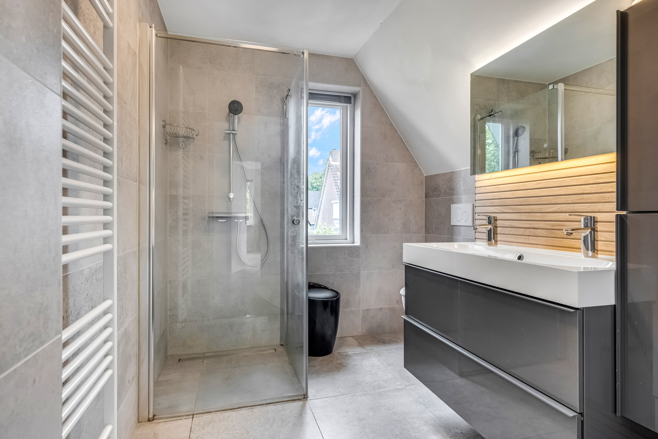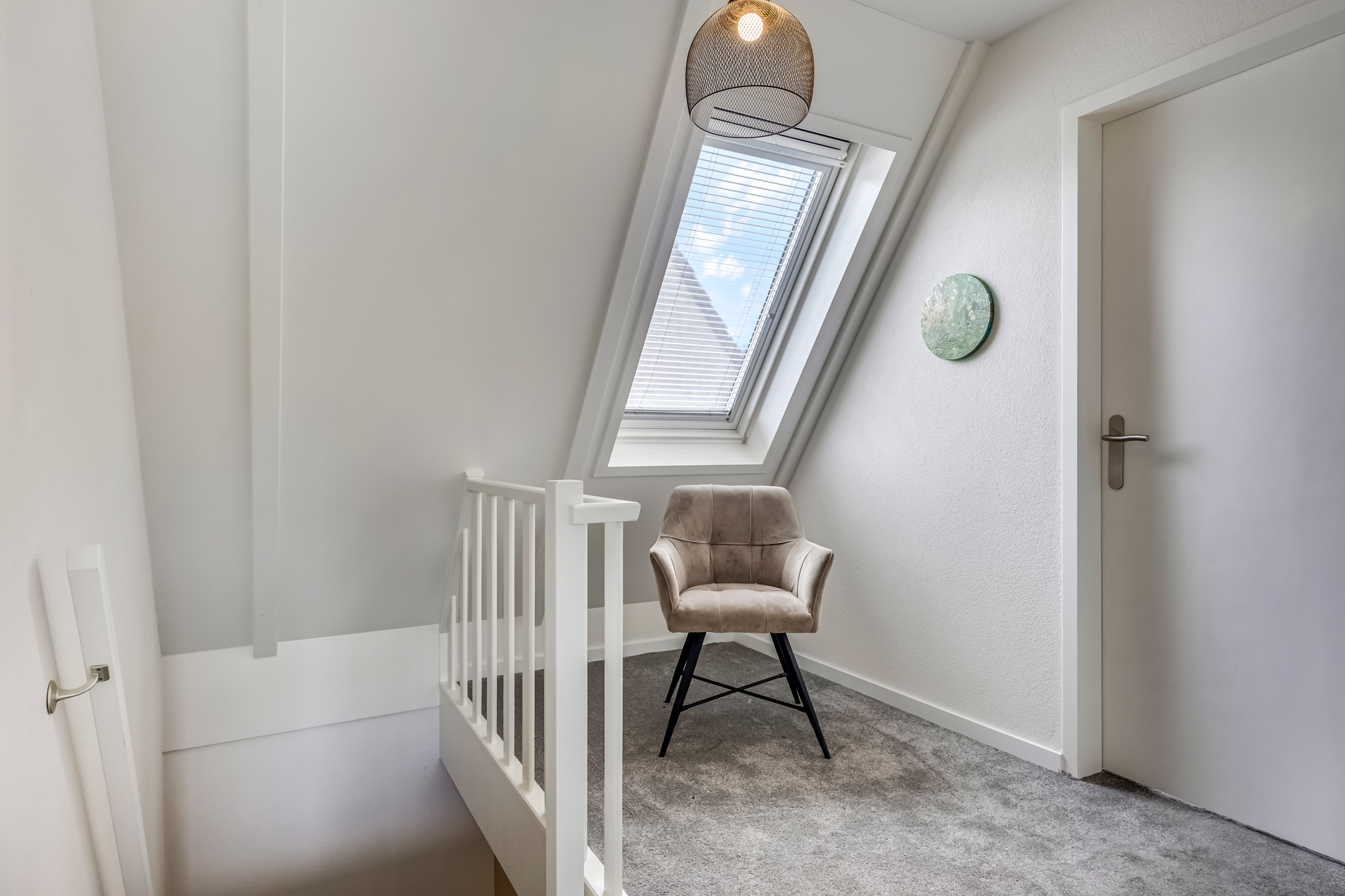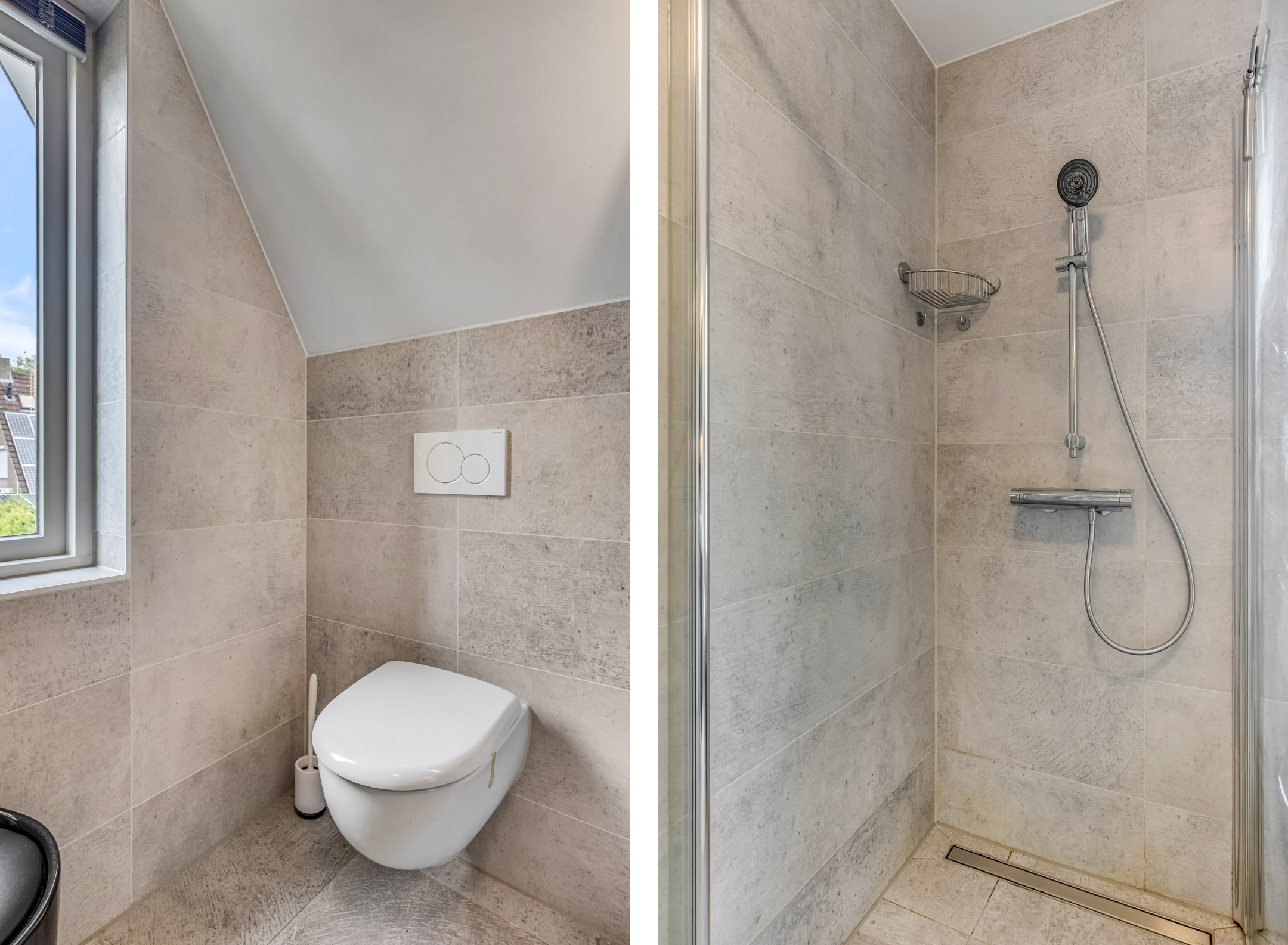 De trap in de hal brengt je naar de 1e verdieping. Hier zijn 2 slaapkamers, voorheen 3, en de badkamer. De co mfortabele badkamer uit 2021 is geheel betegeld en van alle gemakken voorzien. Zo vind je hier een douche met drain, wastafelmeubel met spiegel, zwevend toilet en design radiator. De master bedroom aan de voorkant is voorzien van een heerlijke airco, ruime inloopkast en dakkapel (2021). Eventueel is er de mogelijkheid voor een 3e slaapkamer, zoals het oorspronkelijk was. Aan de achterkant van de woning bevind zich de andere ruime slaapkamer met dakkapel. De gehele verdieping is wederom voorzien van stucwerk op muren en plafond en rolluiken. Totaal zijn er 3 dakkapellen.