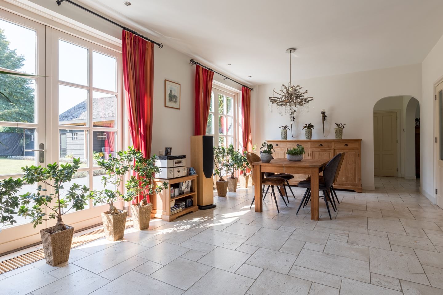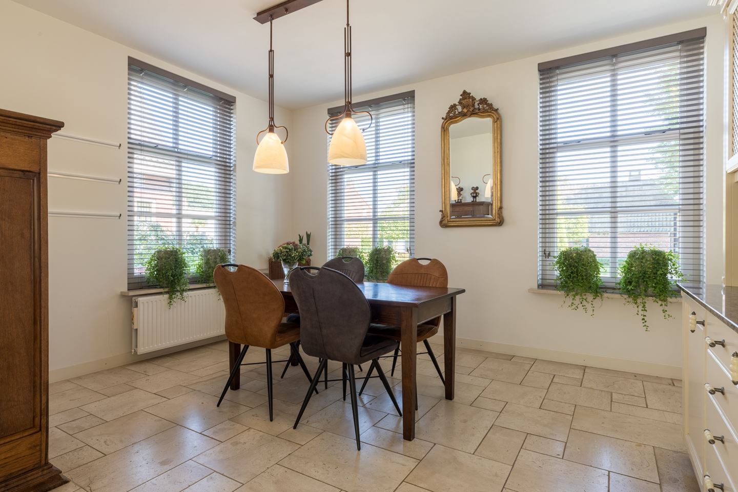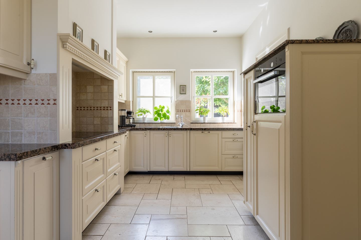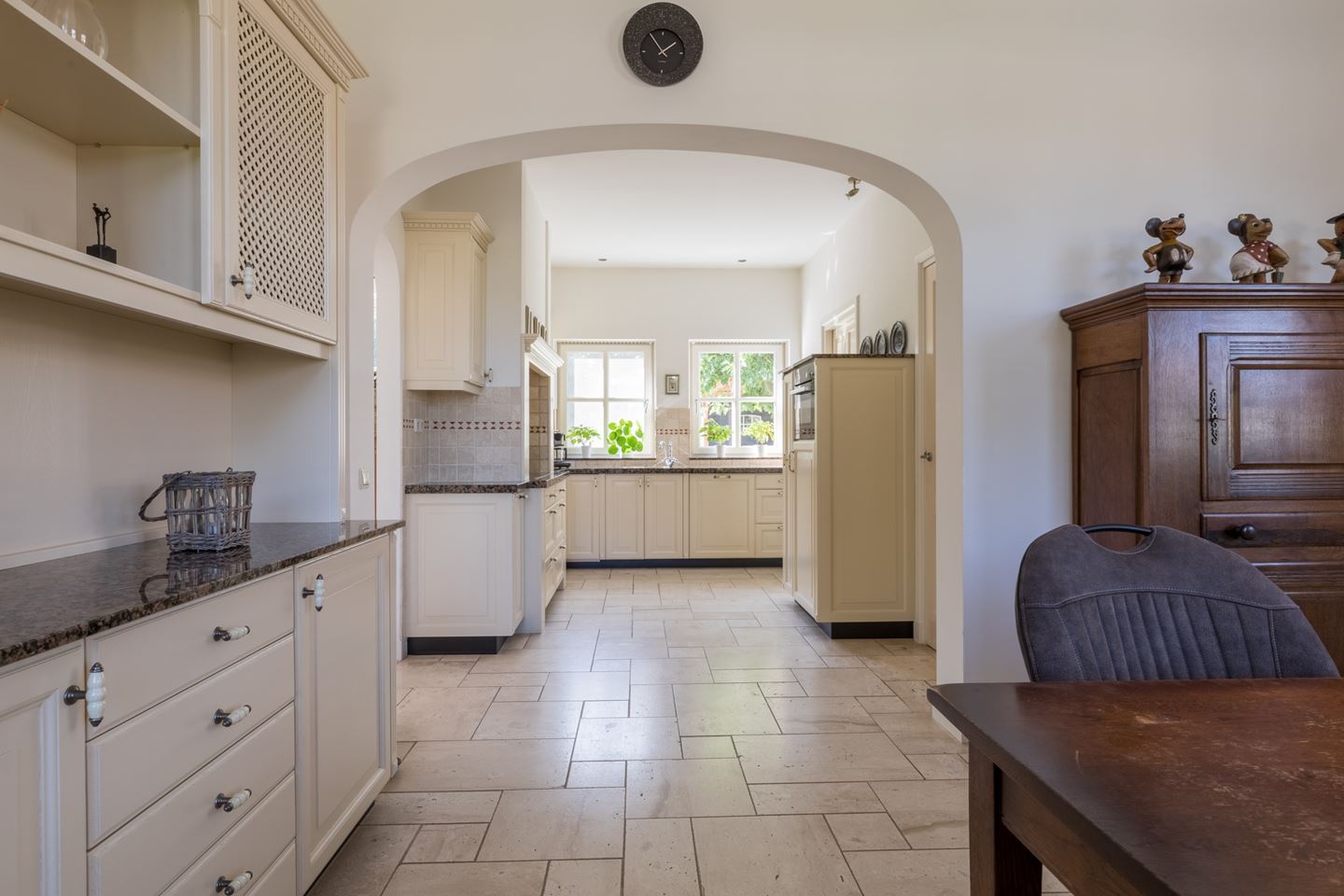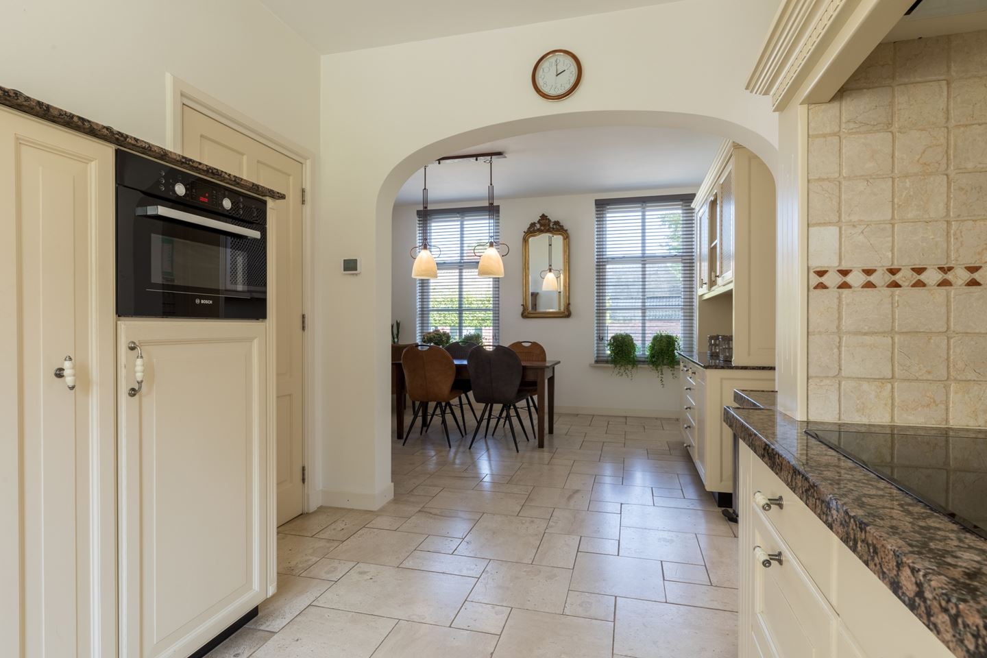 De keuken in landhuis stijl is voorzien van houten fronten en het binnenwerk is van multiplex met HPL toplaag. Het granieten blad, stollen en de schouw maken het geheel helemaal af. De keuken is voorzien van een brede inductie kookplaat , inbouw-afzuigkap, combi-oven, vaatwasser en een koelkast. Alle apparatuur is van het A-merk Bosch. Vanuit de keuken is er toegang tot de eetkamer middels een toog, kelderkast en via de hal met grote bergkast bereikt u de tuin.