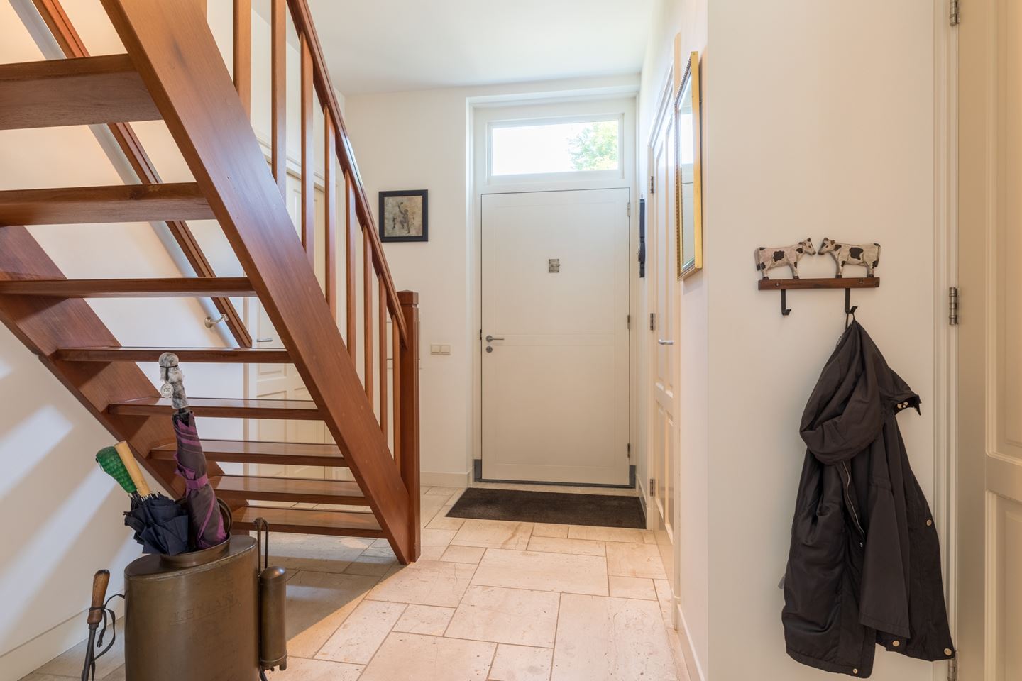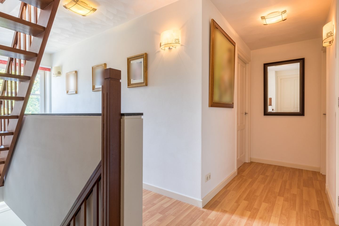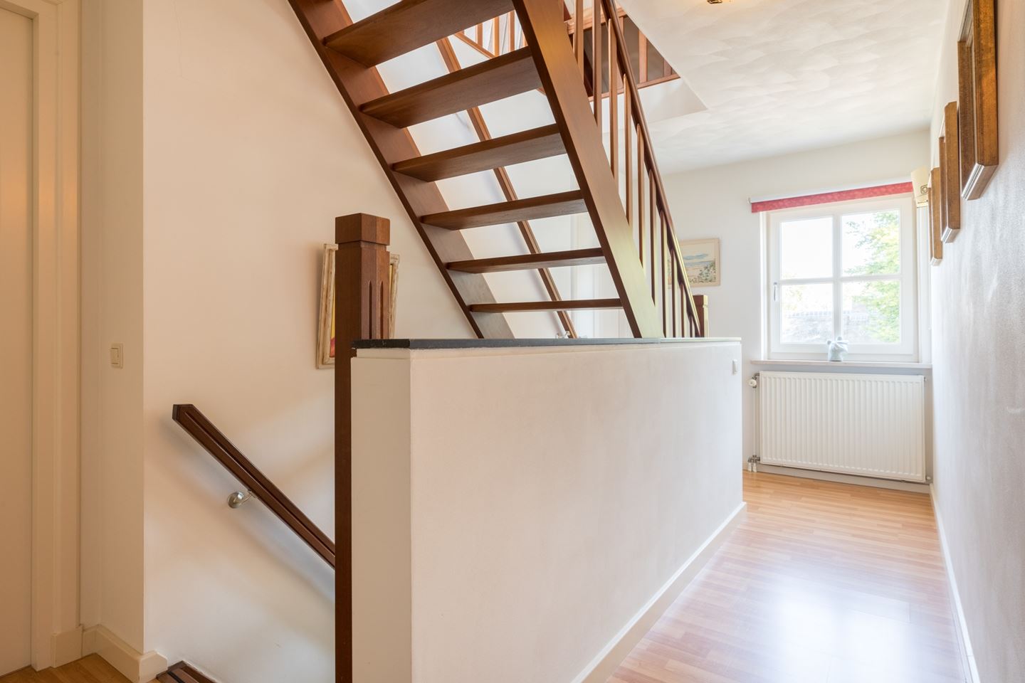 De fraaie ontvangsthal geeft toegang tot de sfeervolle woonkamer, eetkamer, keuken met kelderkast, toilet en trapopgang naar de eerste verdieping. Het toilet is betegeld en voorzien van hangtoilet en fontein. Woonkamer De sfeervolle woonkamer in L-vorm is zeer ruim te noemen met uitzicht op de mooie tuin welke te bereiken is via opslaande tuindeuren.