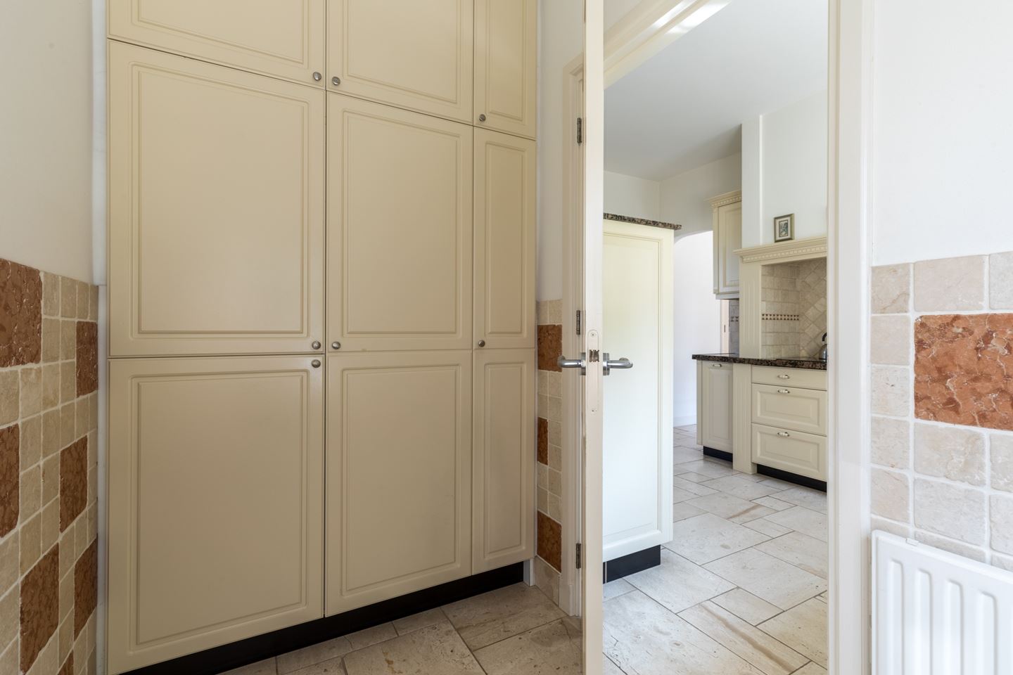 Deze sluit perfect aan bij de keuken en is ook zeer ruim te noemen. De servieskast is ook doorgetrokken in de stijl van de keuken.