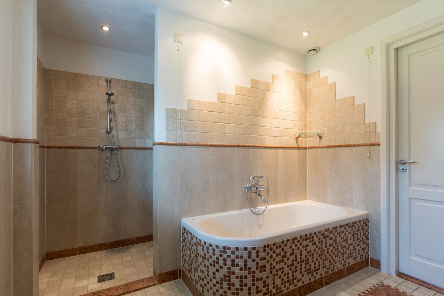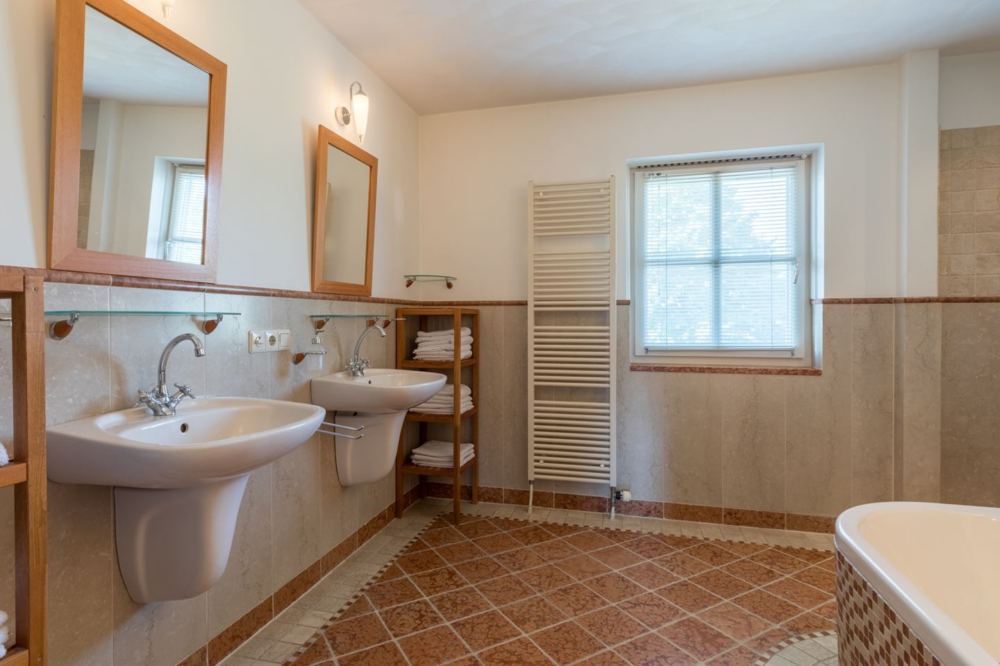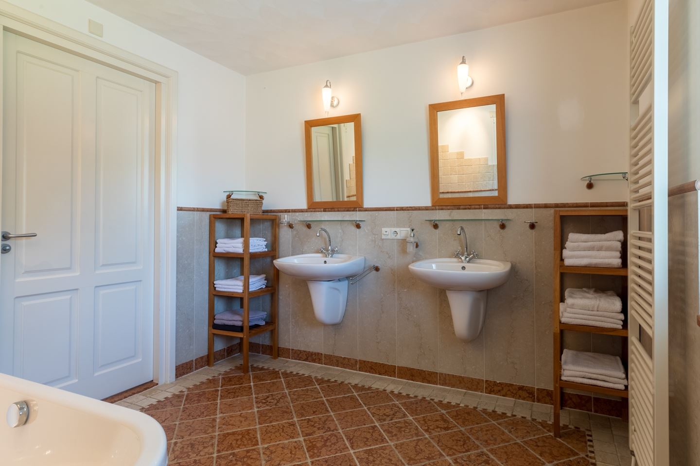 De ruime badkamer is zeer praktisch ingedeeld, gedeeltelijk betegeld en voorzien van een kunststof whirlpool-hoekligbad, een inloopdouche, radiator en twee wastafels. De vloerverwarming zorgt ervoor dat er altijd een behaaglijke temperatuur mogelijk is.