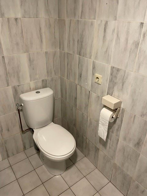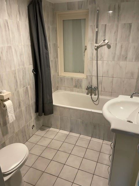 De ruime badkamer is netjes betegeld en voorzien van ligbad, radiator, wastafel en toilet.