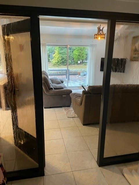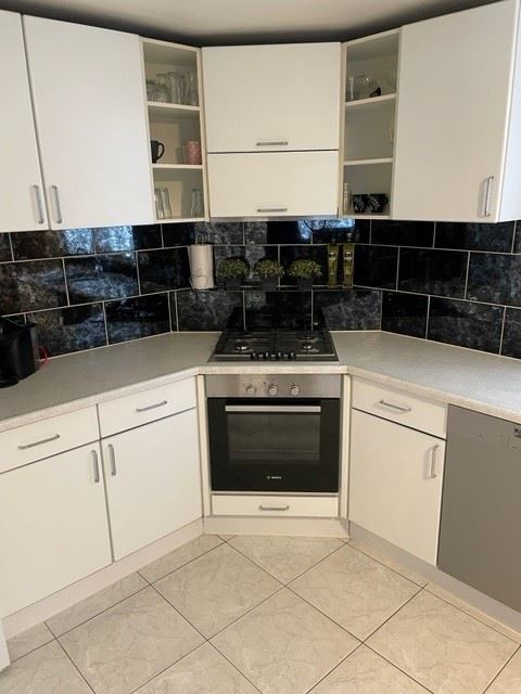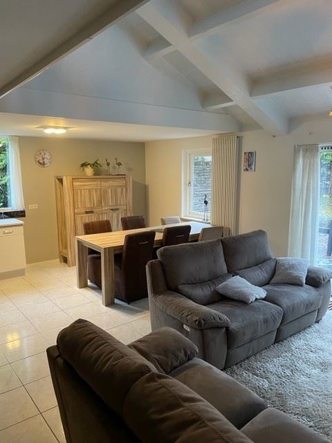 Woonkamer met open haard en schuifpui naar het terras. De woonkamer staat in open verbinding met de L-keuken voorzien van spoelbak, gaskookplaat, oven, afzuigkap en vaatwasser. Het is een heerlijk lichte, zonnige woonkamer. Vanuit de woonkamer heeft u zicht op de grote tuin. De woonkamer is netjes afgewerkt en ruim genoeg voor het plaatsen van een royale zithoek en eettafel. De gashaard zorgt voor extra sfeer en behaaglijkheid. Ideaal in gebruik en zeer gebruiksvriendelijk.
