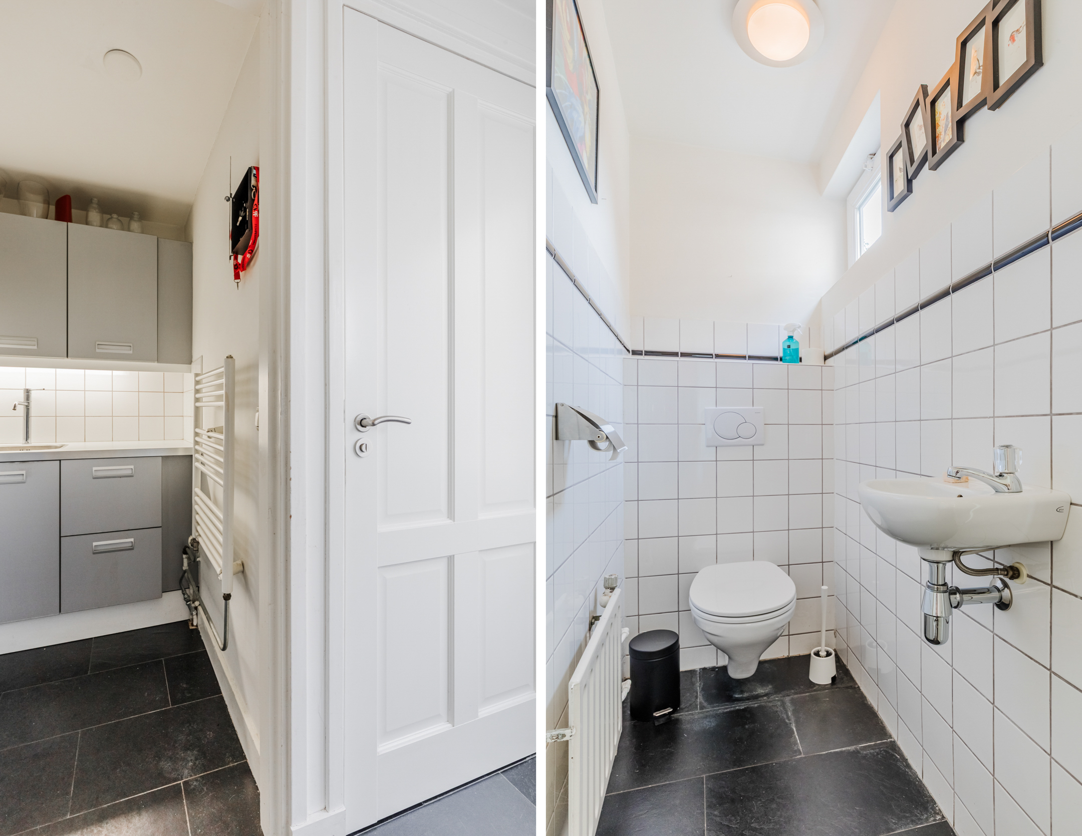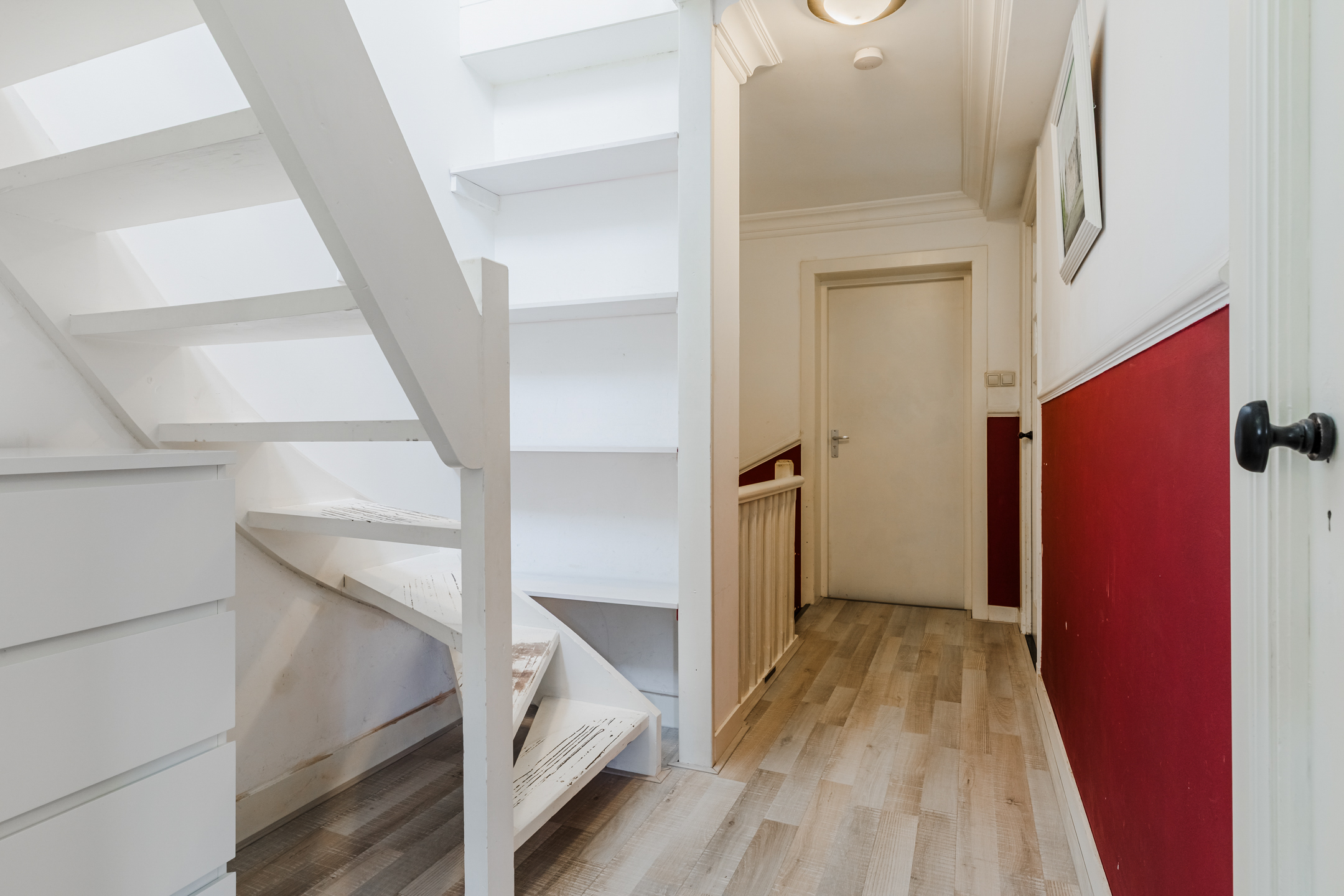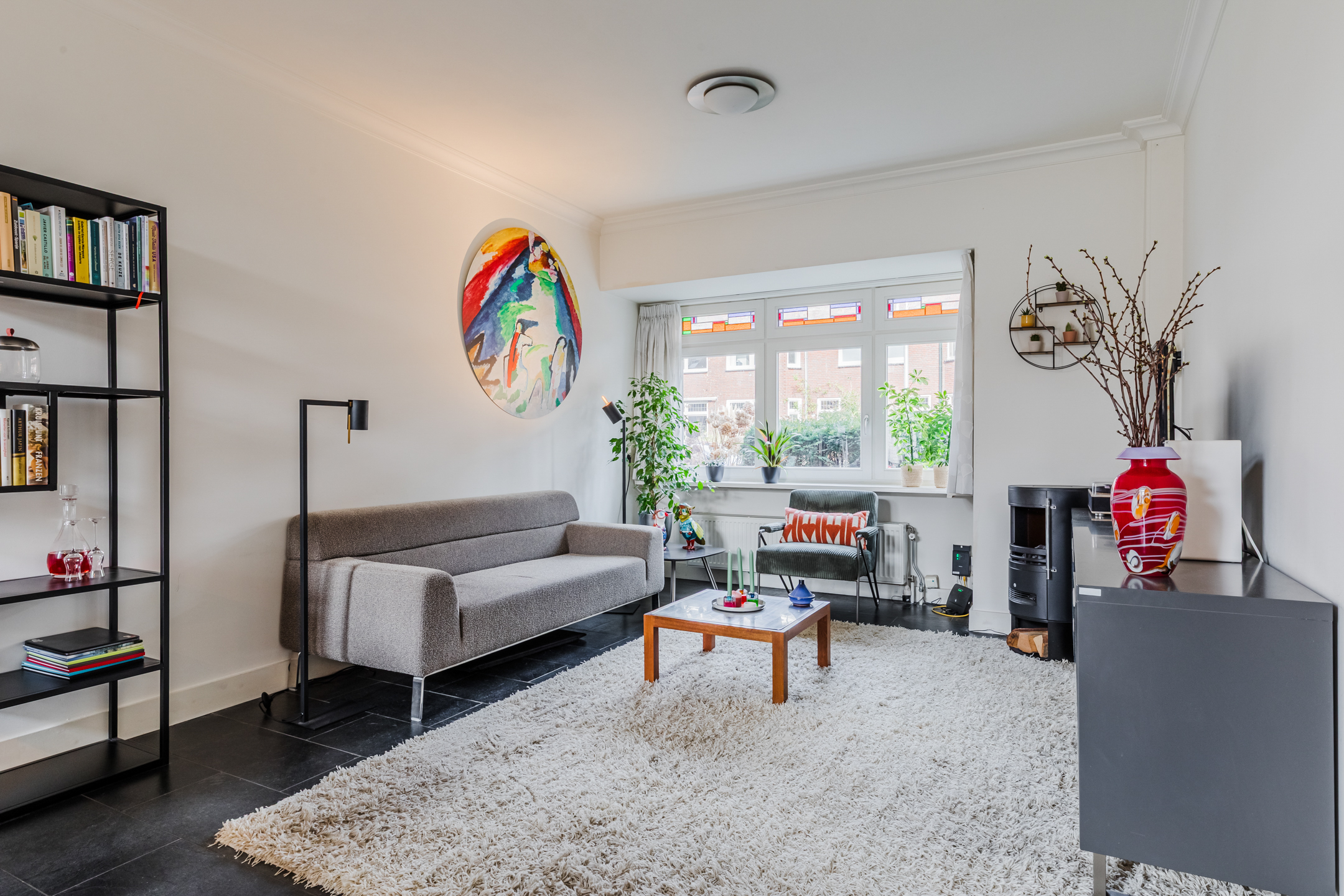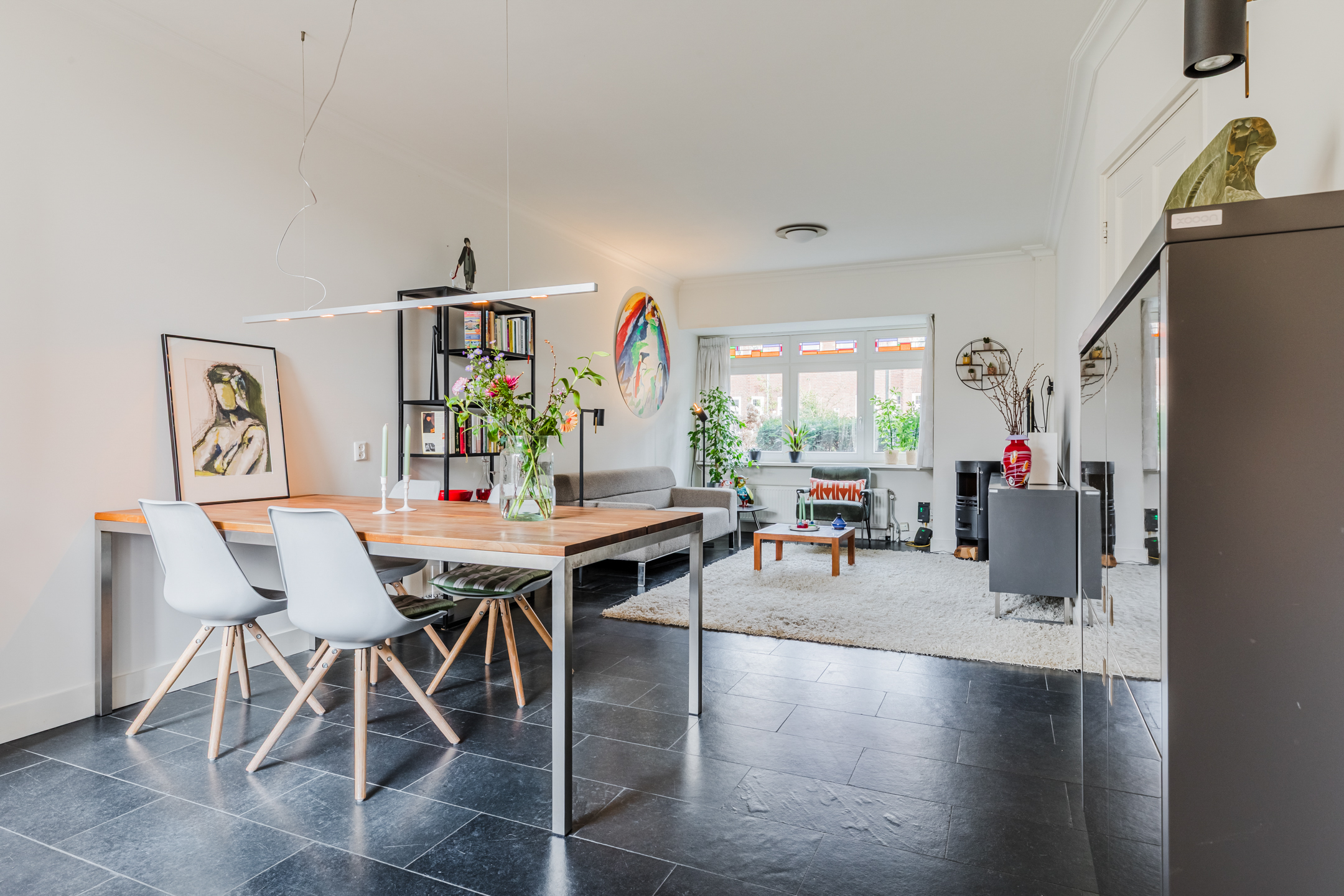 Woonkamer: De heerlijke woonkamer met hoge plafonds en erker met glas in lood ramen strekt zich uit over de gehele lengte van het huis. Hier is ruimte genoeg voor een grote eettafel en een royale zithoek. Aan de achterzijde heb je uitzicht op de zonnige achtertuin. Onder de trap bevinden zich de meterkast en de voorraadkast. De muren en plafonds zijn voorzien van strak stucwerk.