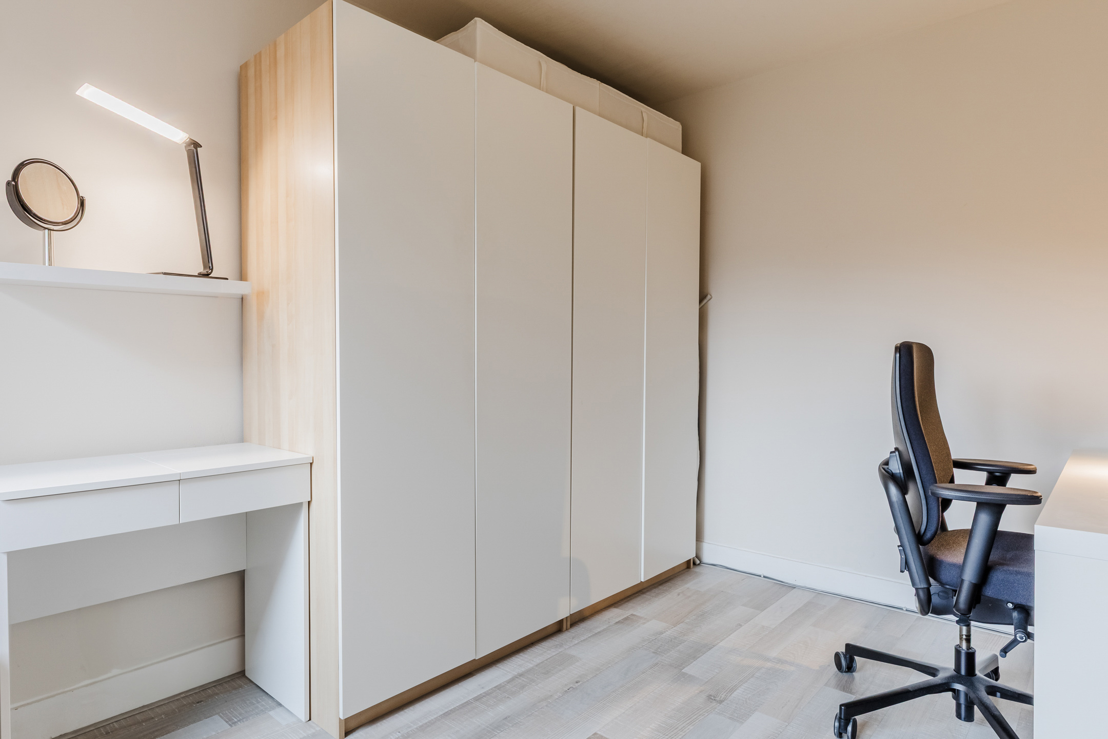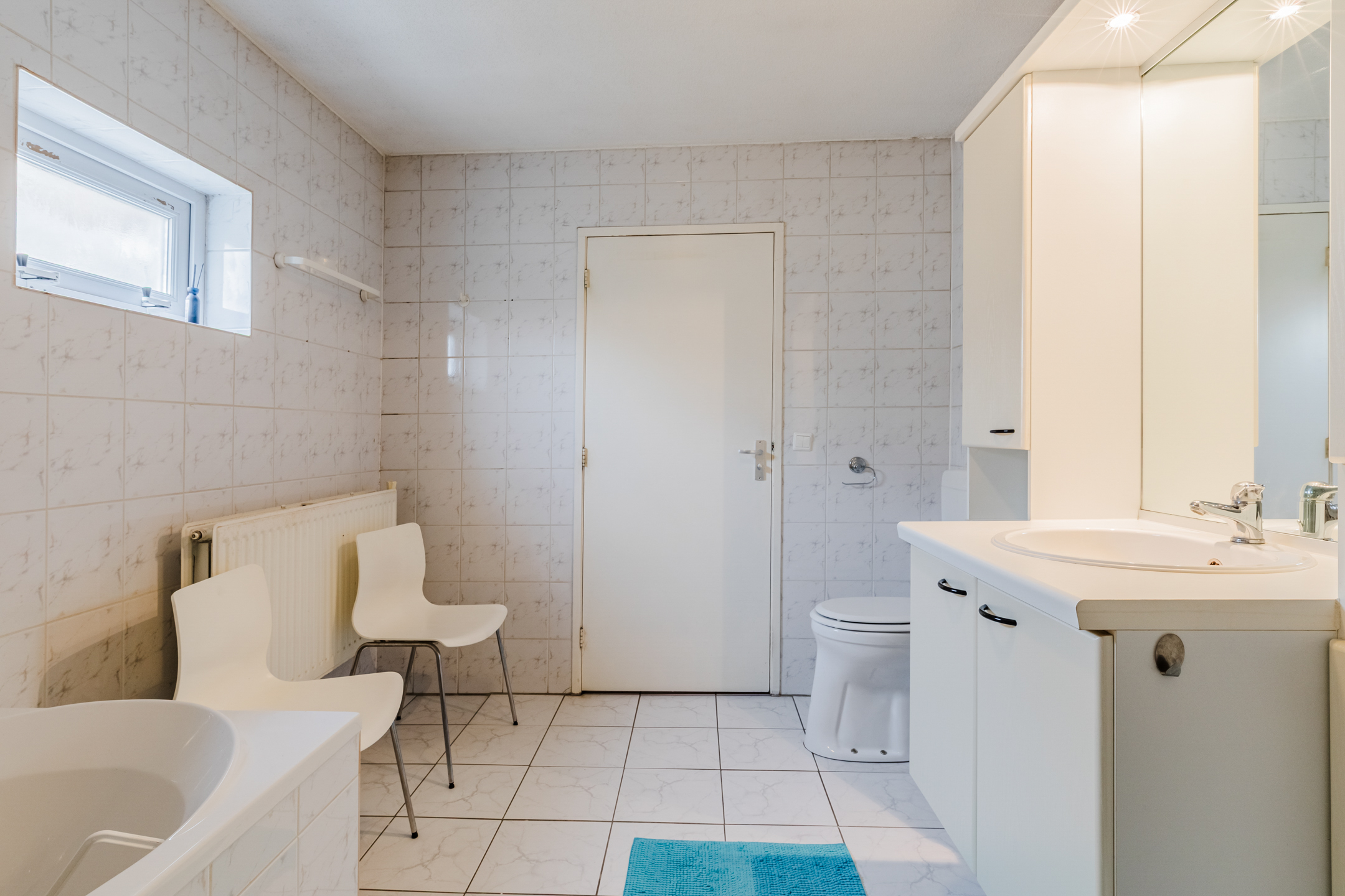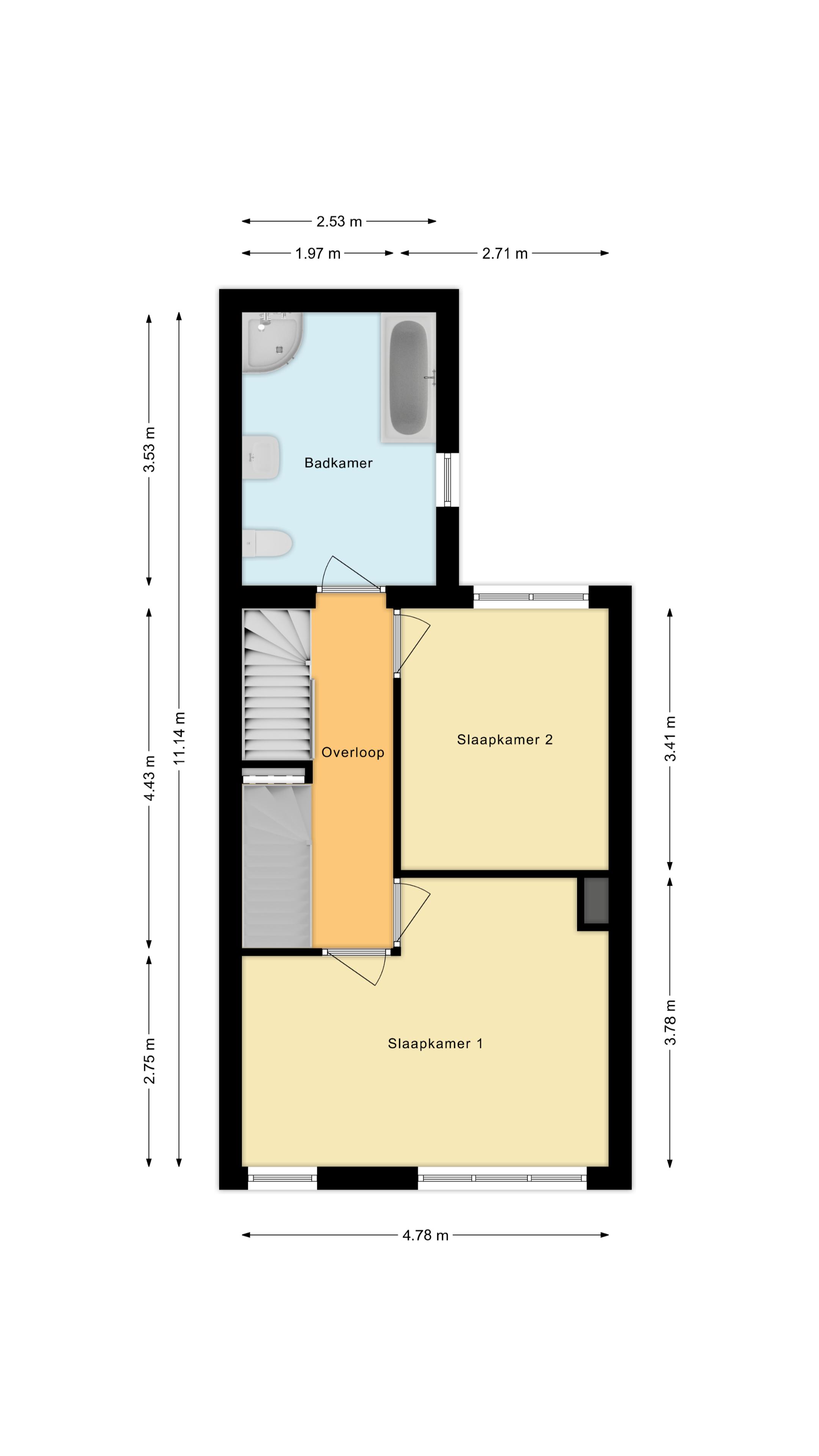 Via de vaste trap bereik je de eerste verdieping. Hier bevinden zich 2 slaapkamers, de badkamer en een ruime overloop. De "masterbedroom" (voorheen 2 kamers) bevindt zich aan de voorzijde van de woning, waardoor hier tevens ruimte is voor een fijne werkplek. De muren en plafonds zijn ook hier voorzien van strak stucwerk. Op de uitbouw bevindt zich de grote badkamer die volledig betegeld is en beschikt over een wastafelmeubel, toilet, ligbad en douchecabine. Hier kom je heerlijk tot rust na een drukke dag.