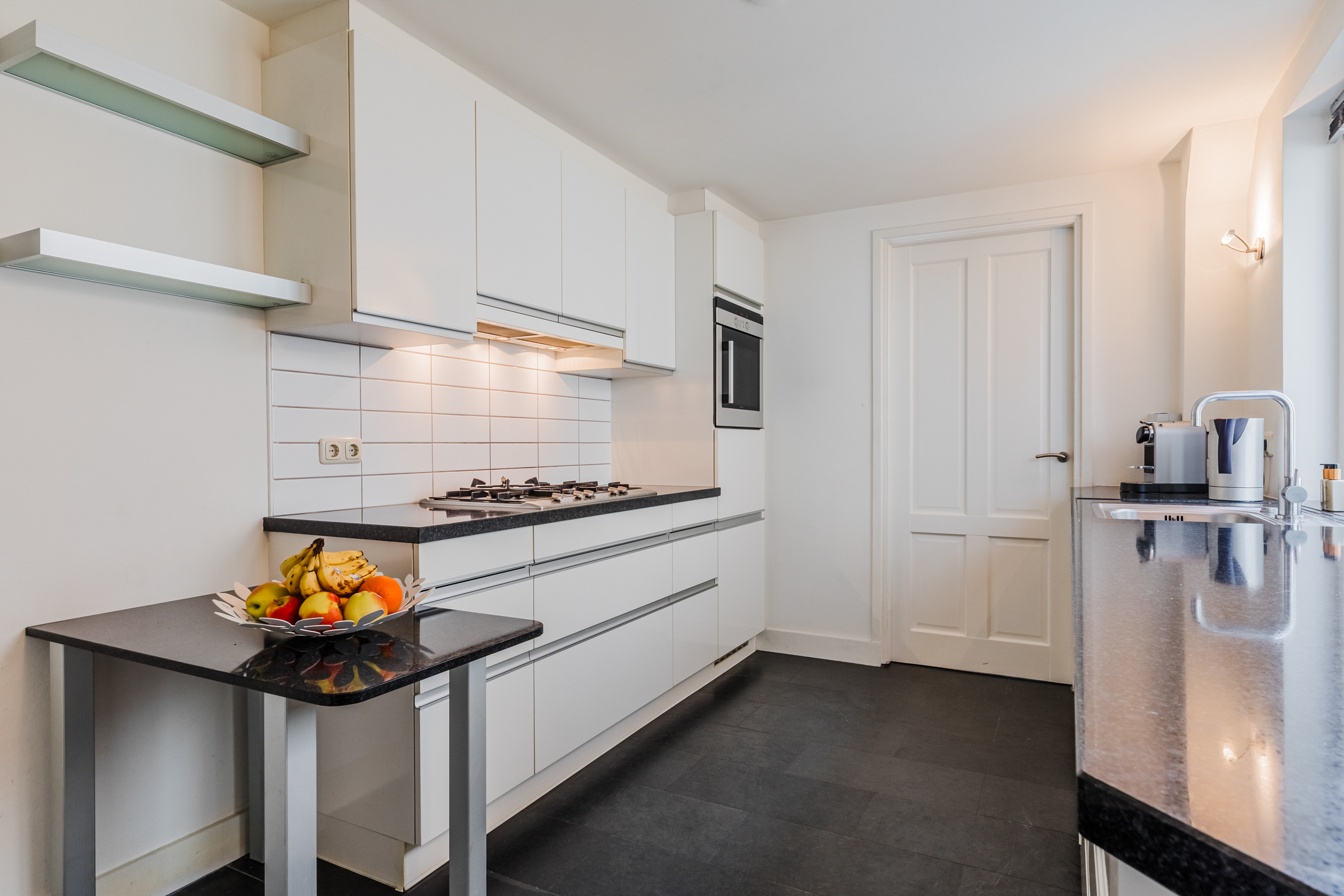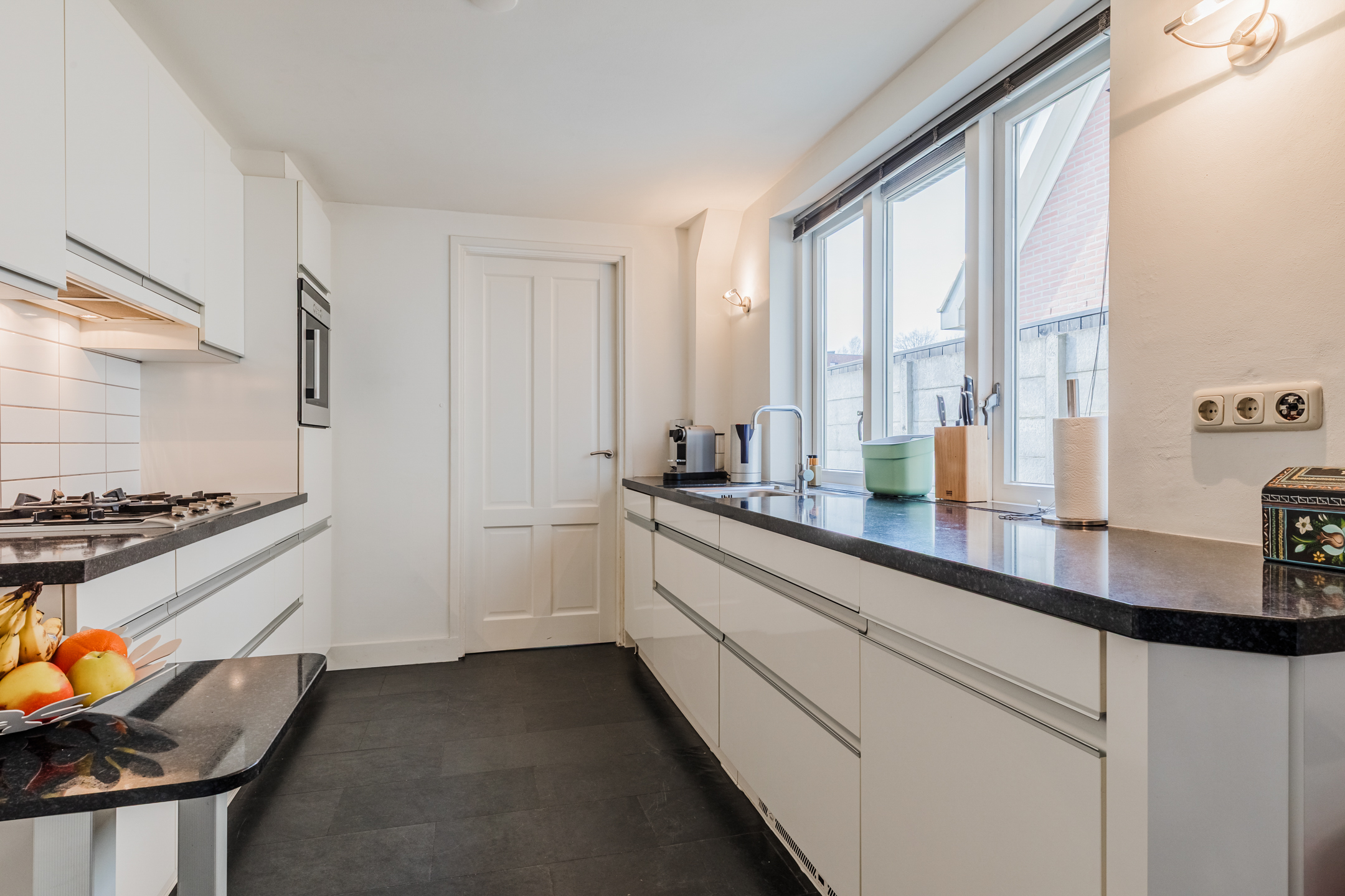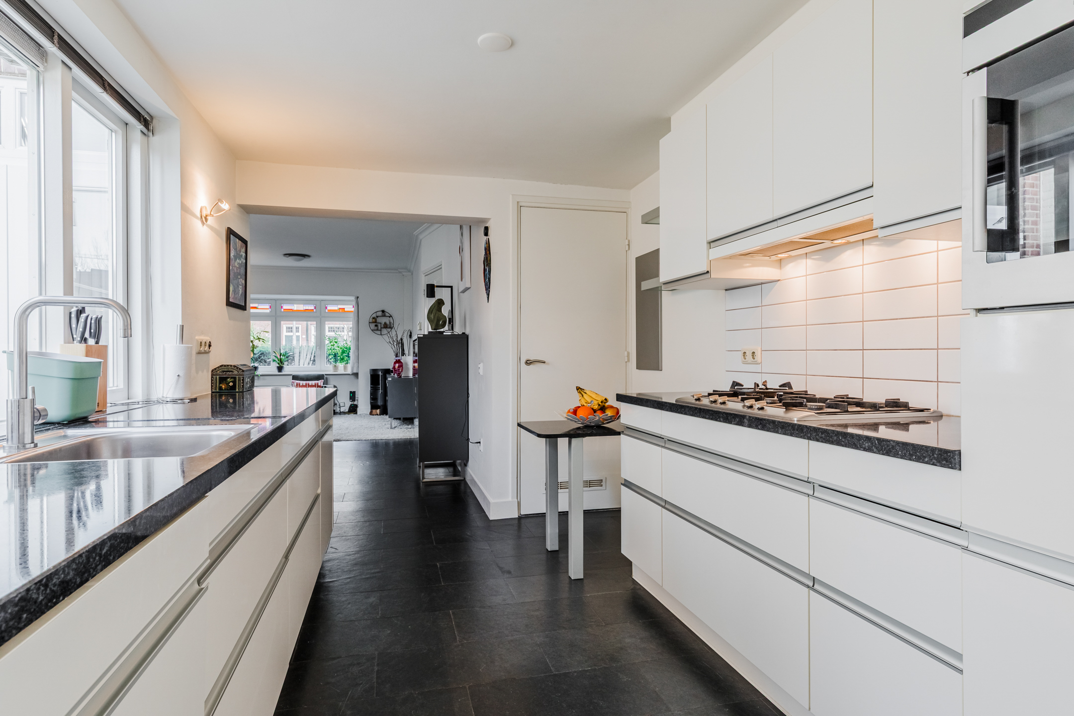 Keuken: Aan de achterzijde van de woning bevindt zich de mooie keuken in parallel opstelling, voorzien van granieten werkblad , koelkast, oven, vaatwasser, afzuigunit en 5 pits gaskookplaat met wokbrander. Achter de keuken is de toegang naar de bijkeuken, ingebouwde Cv ketel en aansluiting wasmachine en droger, toilet en de achterdeur. De tuin is ook bereikbaar via de openslaande tuindeuren.