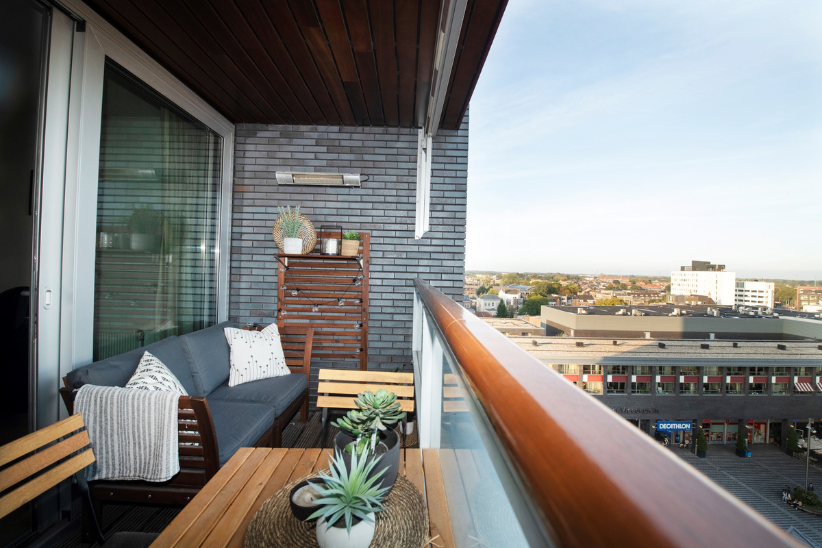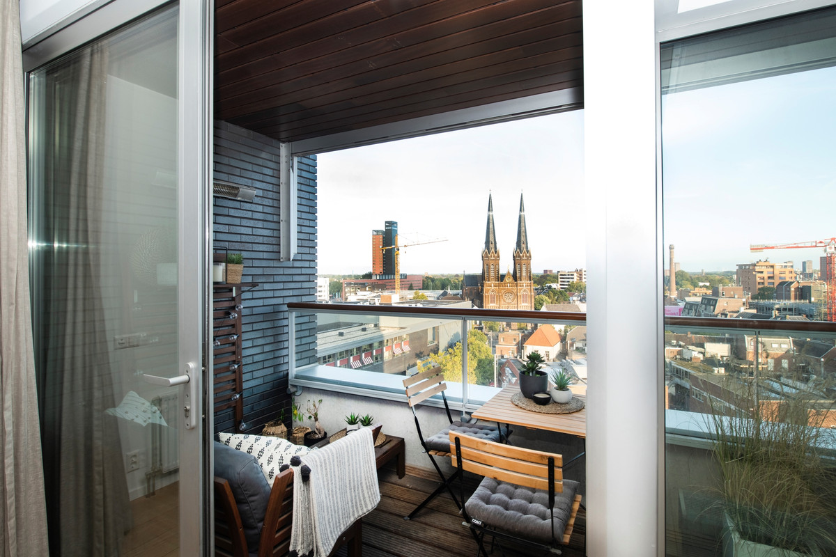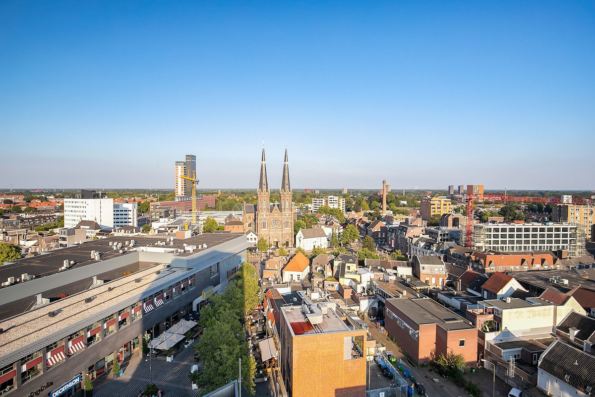 Buiten: Vanaf het inpandige balkon voorzien van schuifpui heeft u een schitterend uitzicht over het Pieter Vreedeplein, de heuvelse kerk en de omgeving van Tilburg.
