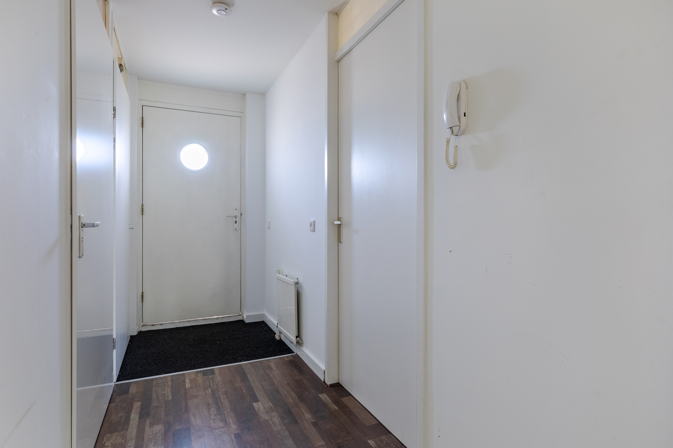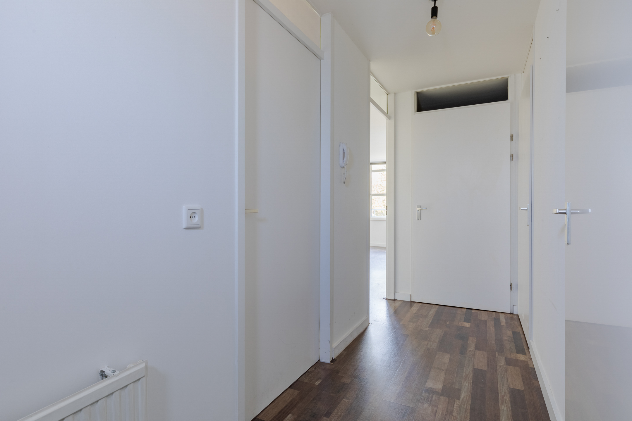 Wanneer je de voordeur van het appartement opent, kom je terecht in de nette hal. Hier spot je meteen de nette laminaat vloer die doorgetrokken is in het gehele appartement. De hal biedt toegang tot de meterkast, ruime slaapkamer, betegelde badkamer met douche, toilet en wastafel met spiegel, stookruimte met Cv-ketel en aansluiting wasmachine. Tenslotte bevind zich in de hal een kamer die gebruikt kan worden als bergruimte of eventueel als werkplek.