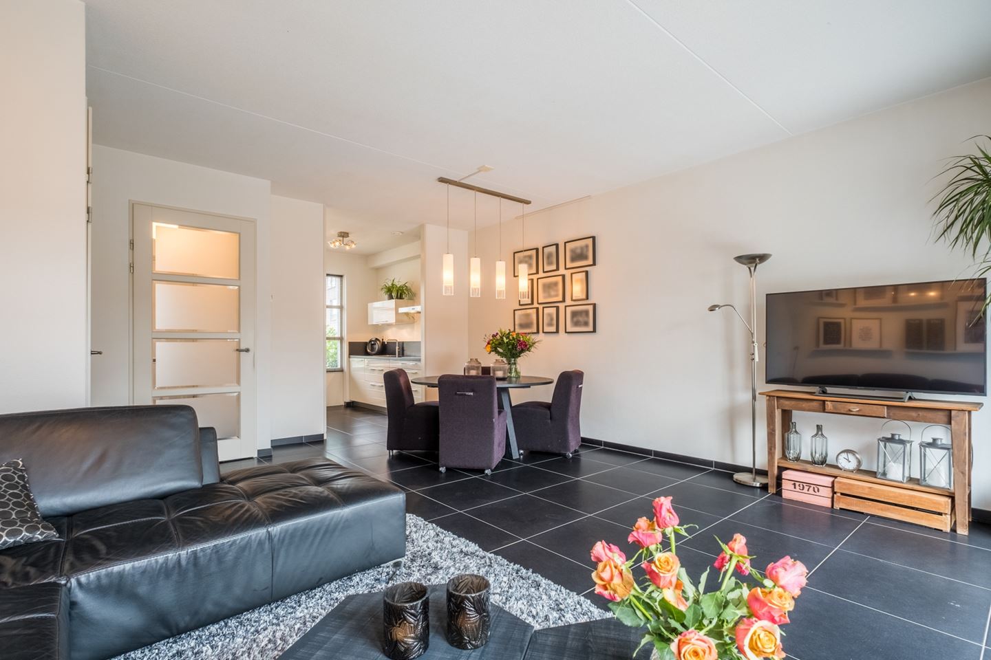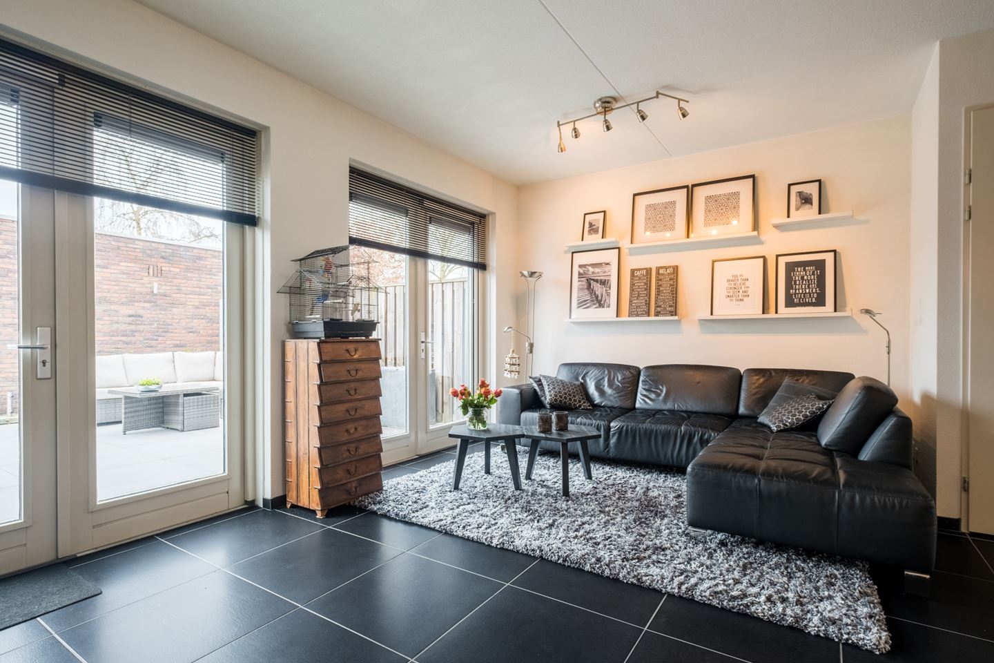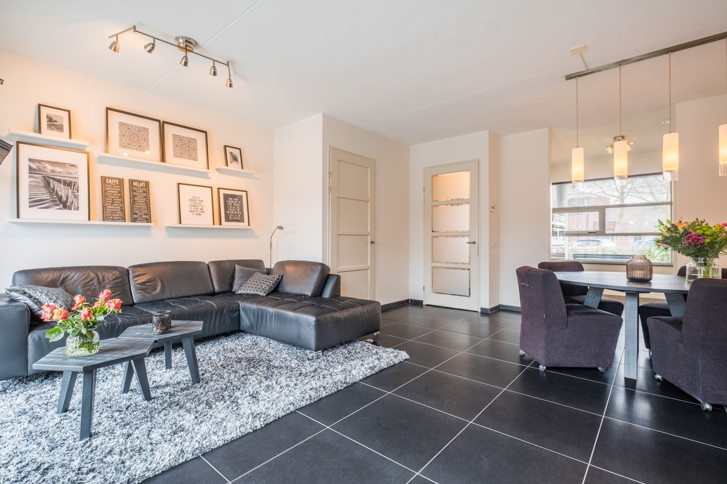 - Ruime woonkamer voorzien van mooie tegelvloer, opdekdeuren en bergkast onder de trap