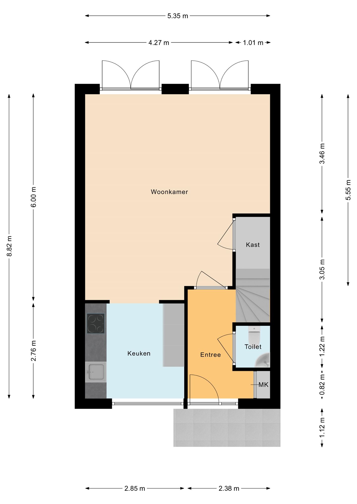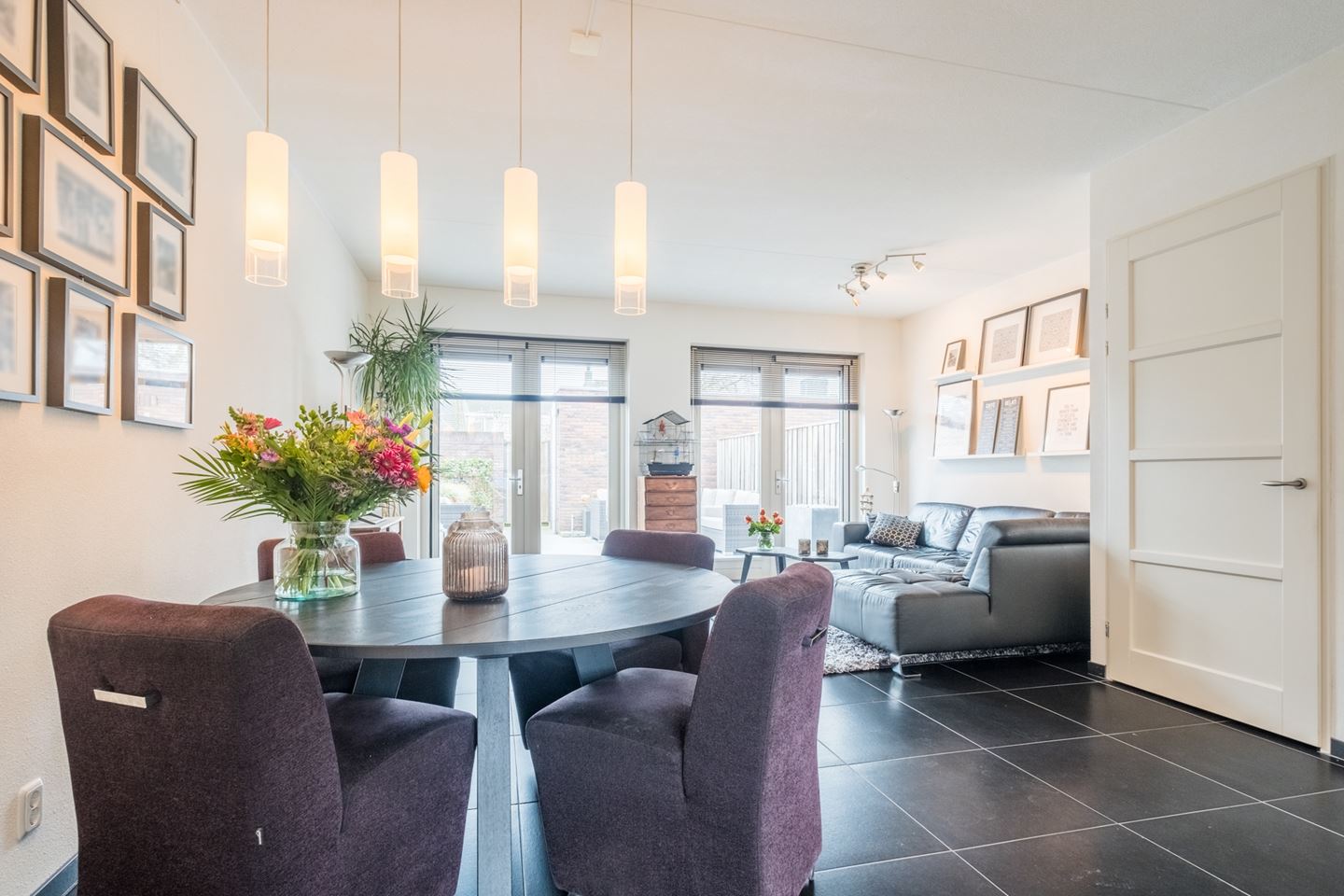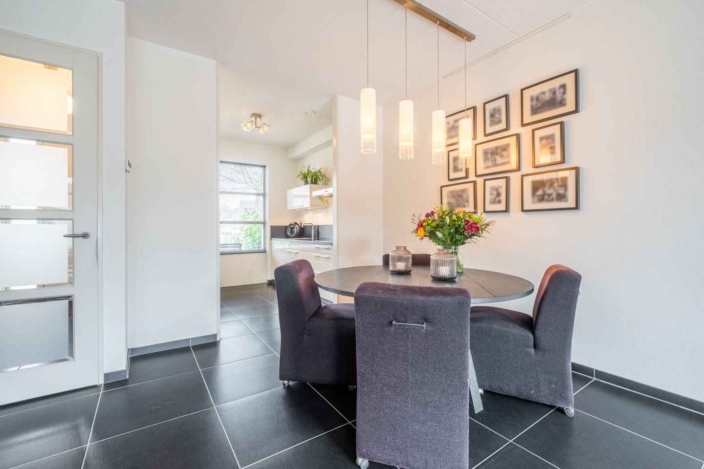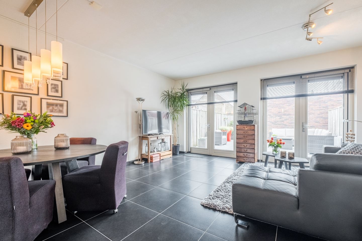 - Ruime woonkamer voorzien van mooie tegelvloer, opdekdeuren en bergkast onder de trap