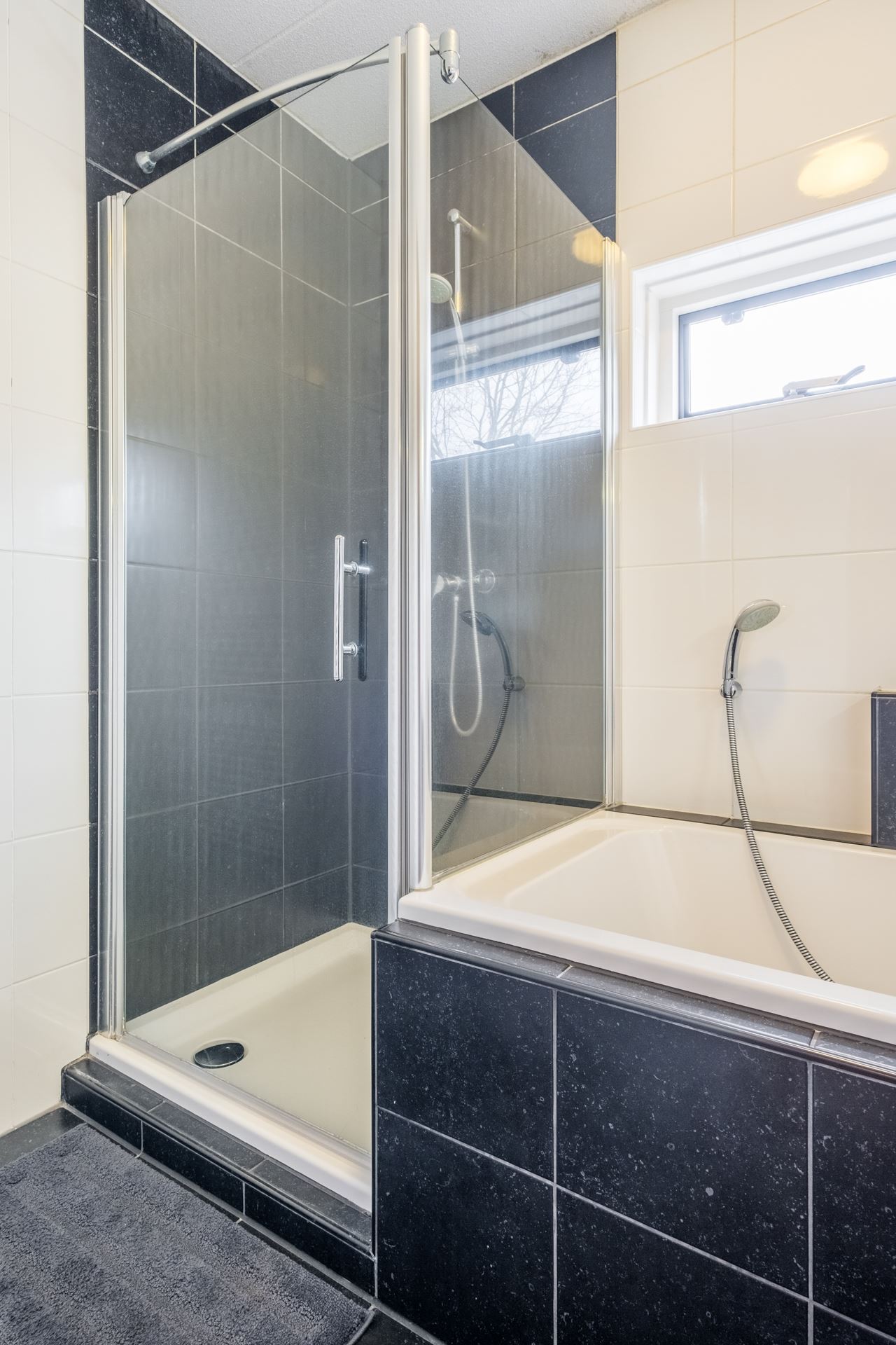 - Badkamer geheel betegeld en voorzien van douche, ligbad en wastafel met spiegel
