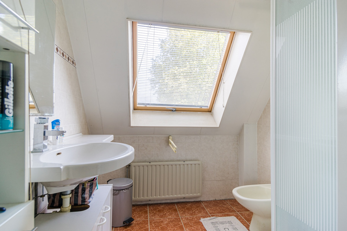 Via de vaste trap bereik je de eerste verdieping van de woning. Deze beschikt over 3 grote slaapkamers, een badkamer en een extra bergkast op de zeer ruime overloop. De grootste slaapkamer bevindt zich aan de voorzijde van de woning. Alle slaapkamers beschikken over een laminaatvloer, die mooi doorloopt op de overloop. De badkamer is volledig betegeld voorzien van een wastafel met ondermeubel, verwarming, een bidet en een douchecabine.