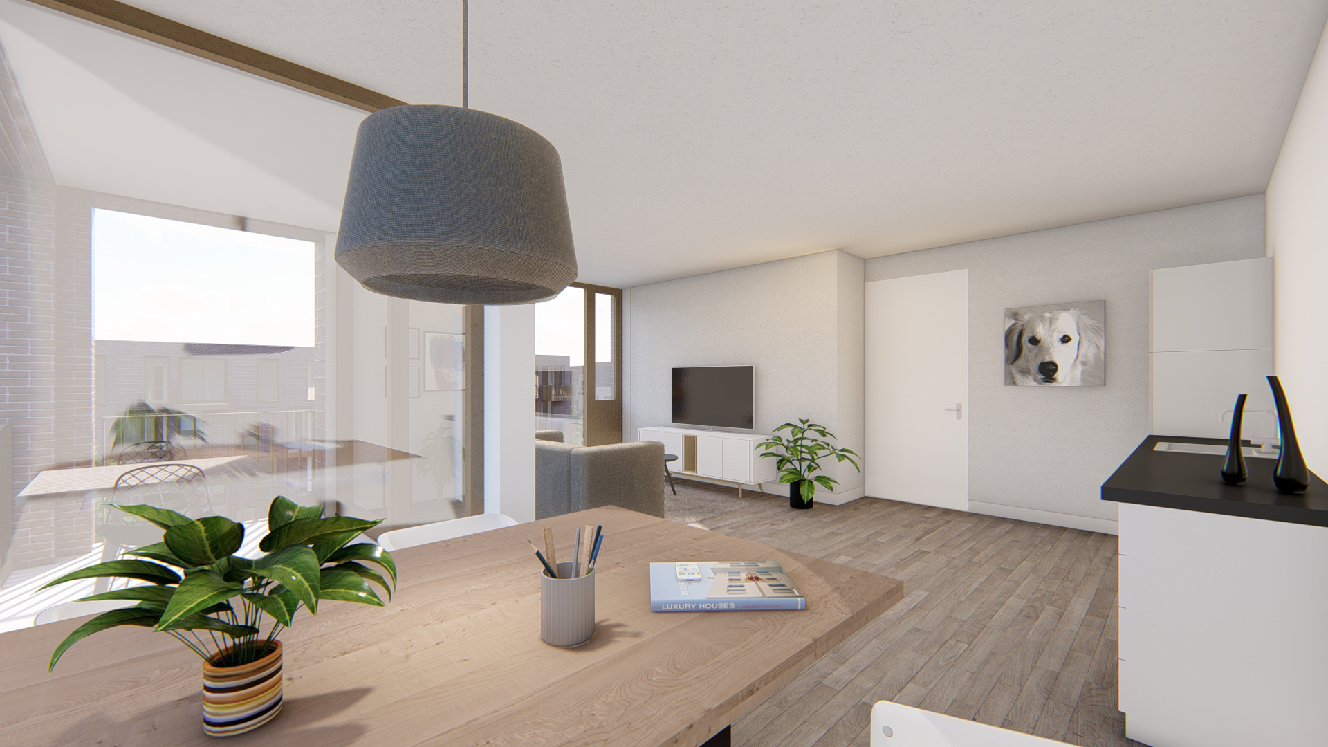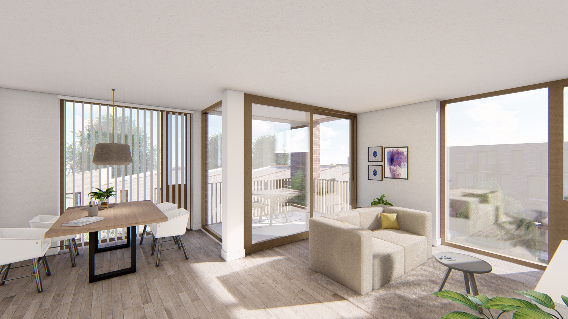 Verdiepingshoge puien garanderen een fraai uitzicht op het park. Daarnaast geven de fraaie ritmiek van de metselwerk gevels en de grote gevelopeningen de woning een modern, industrieel karakter. De 3-kamerappartementen verschillen in grootte en oriëntatie en het parkeren is gemeenschappelijk gelegen in een overdekte parkeervoorziening achter het woongebouw.