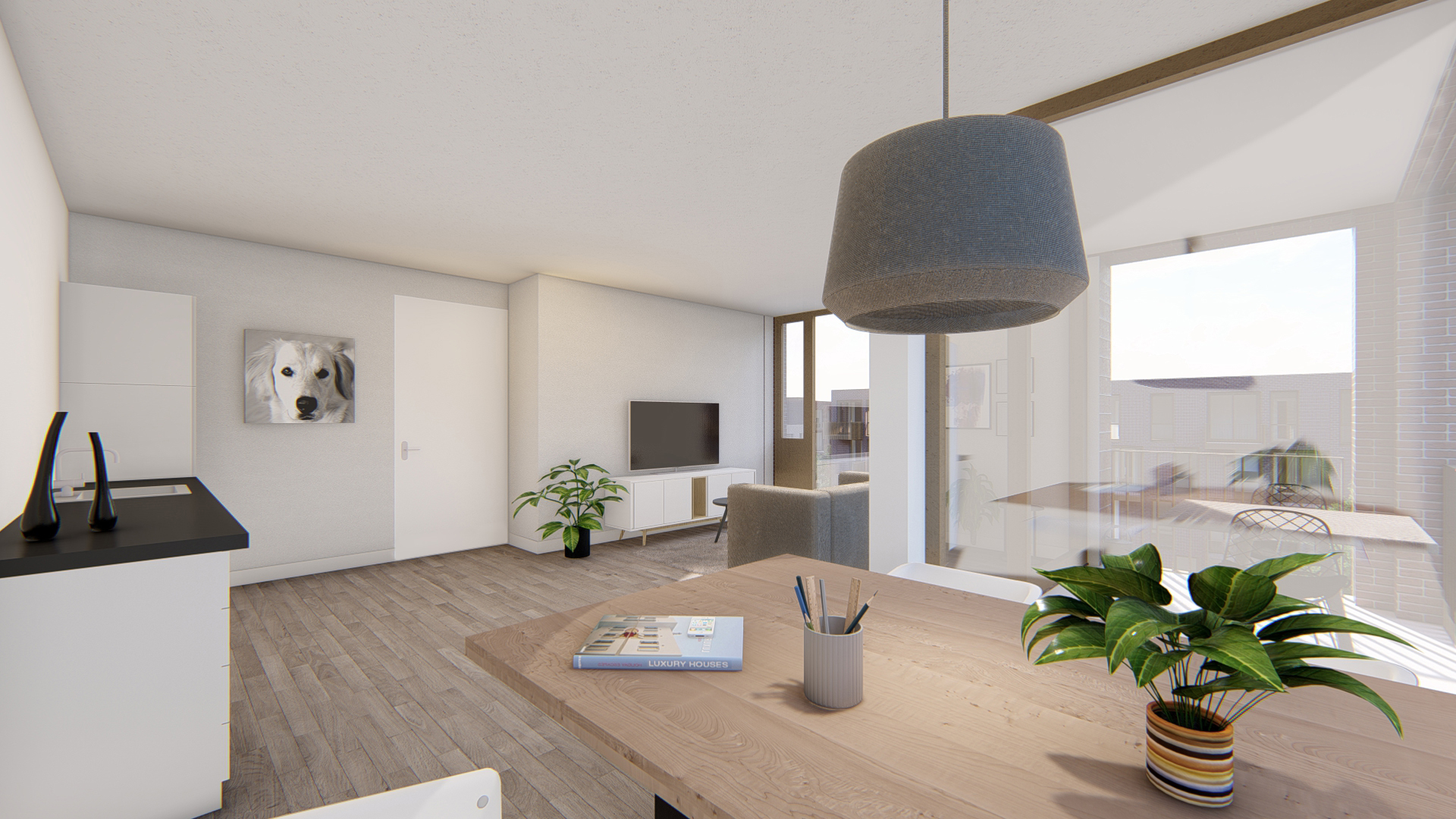 Verdiepingshoge puien garanderen een fraai uitzicht op het park. Daarnaast geven de fraaie ritmiek van de metselwerk gevels en de grote gevelopeningen de woning een modern, industrieel karakter. De 3-kamerappartementen verschillen in grootte en oriëntatie en het parkeren is gemeenschappelijk gelegen in een overdekte parkeervoorziening achter het woongebouw.