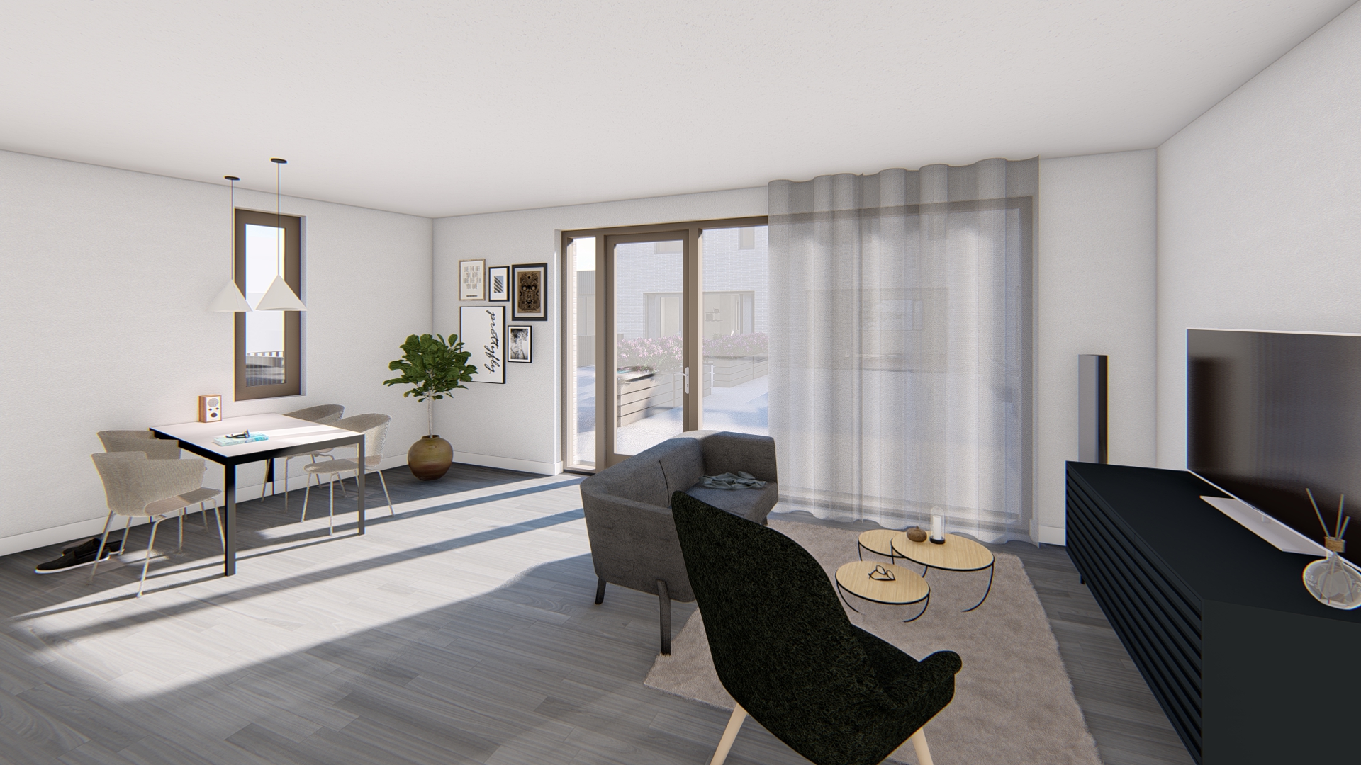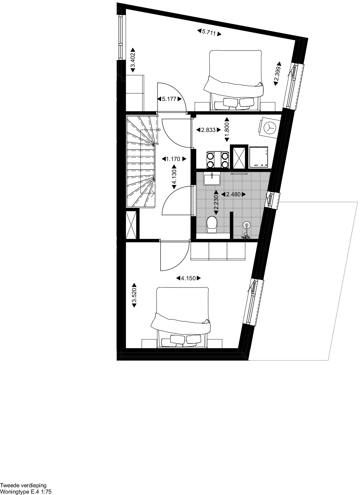 Twee hoofdslaapkamers en ruime badkamer zijn gelegen op de tweede verdieping. Aan de straat liggen de woningtoegang en een verblijfsruimte die dienst kan doen als werkkamer met pantry of als slaapkamer met badkamer en suite. Op de begane grond heeft iedere woning bovendien een eigen buitenberging die bereikbaar is van binnenuit en grenst aan de gemeenschappelijke overdekte parkeervoorziening.