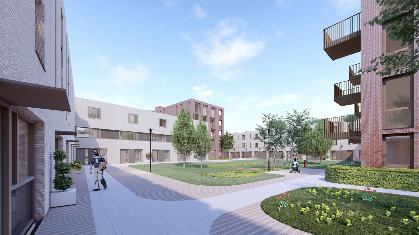 Prominent op de kop van het park ligt woongebouw Kettingscheerderij met enerzijds de Seringenhof en anderzijds de Weverskaarde. Woningblok bestaat uit 6 gezinswoningen en 14 appartementen.