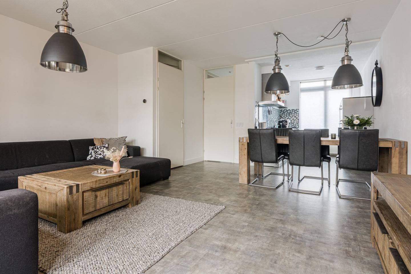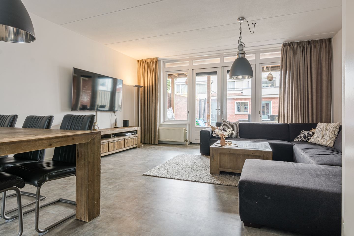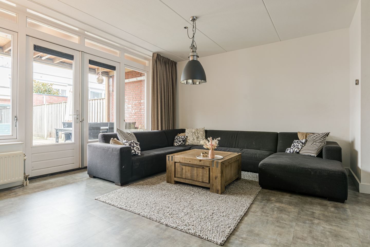 - Ruime tuingerichte woonkamer voorzien van mooie pvc vloer en een ruime bergkast onder de trap