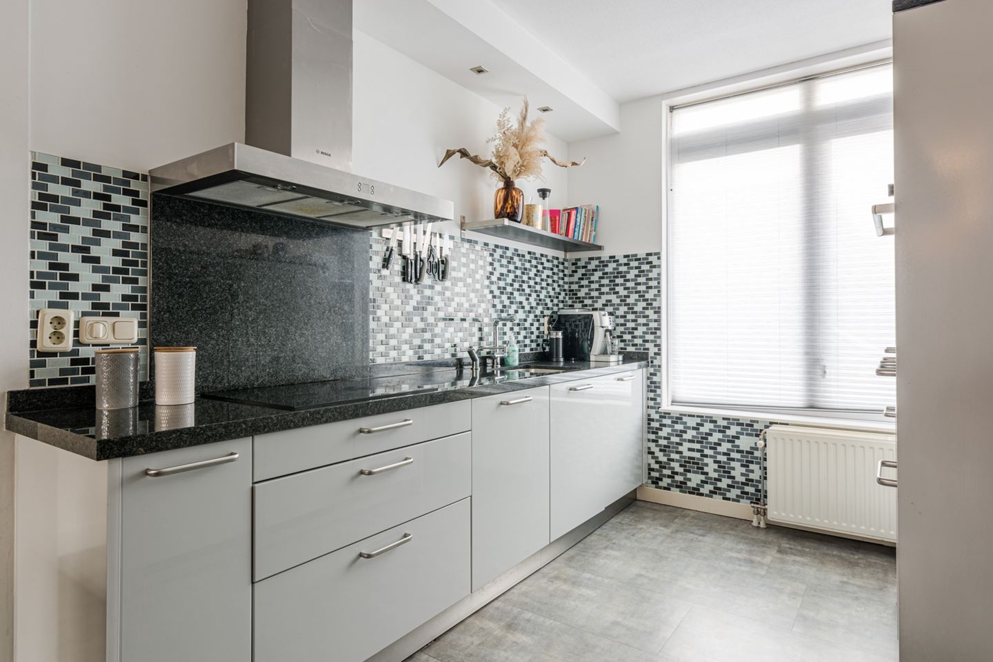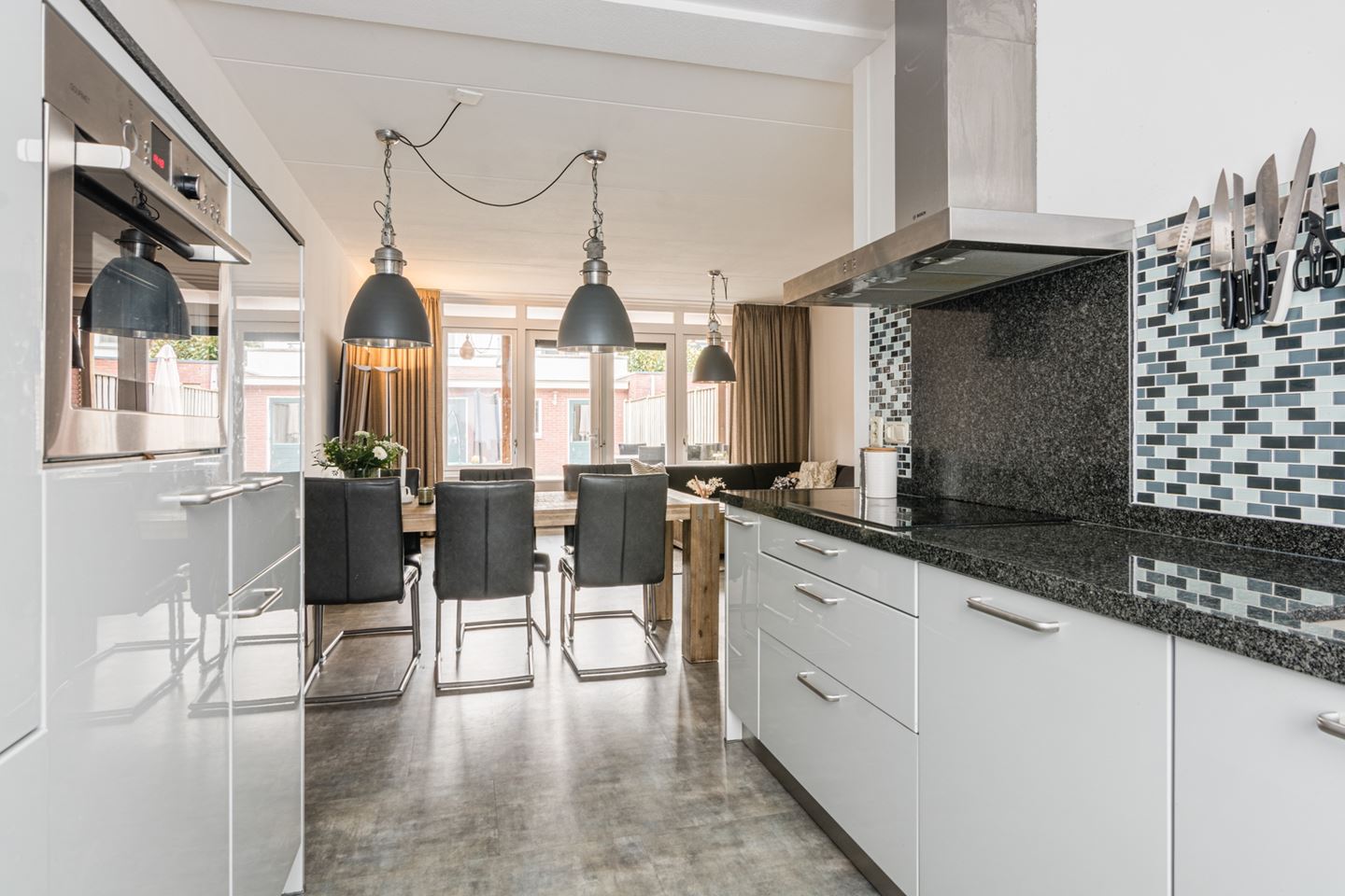 - Keuken in parallel opstelling met granieten blad en Bosch inbouwapparatuur: grote koelkast, losse vriezer, combimagnetron, RVS afzuigkap, inductie kookplaat, quooker en vaatwasser.