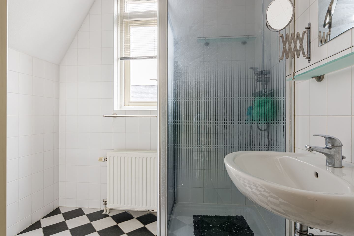 - Badkamer geheel betegeld en voorzien van douche, radiator en wastafel met spiegel