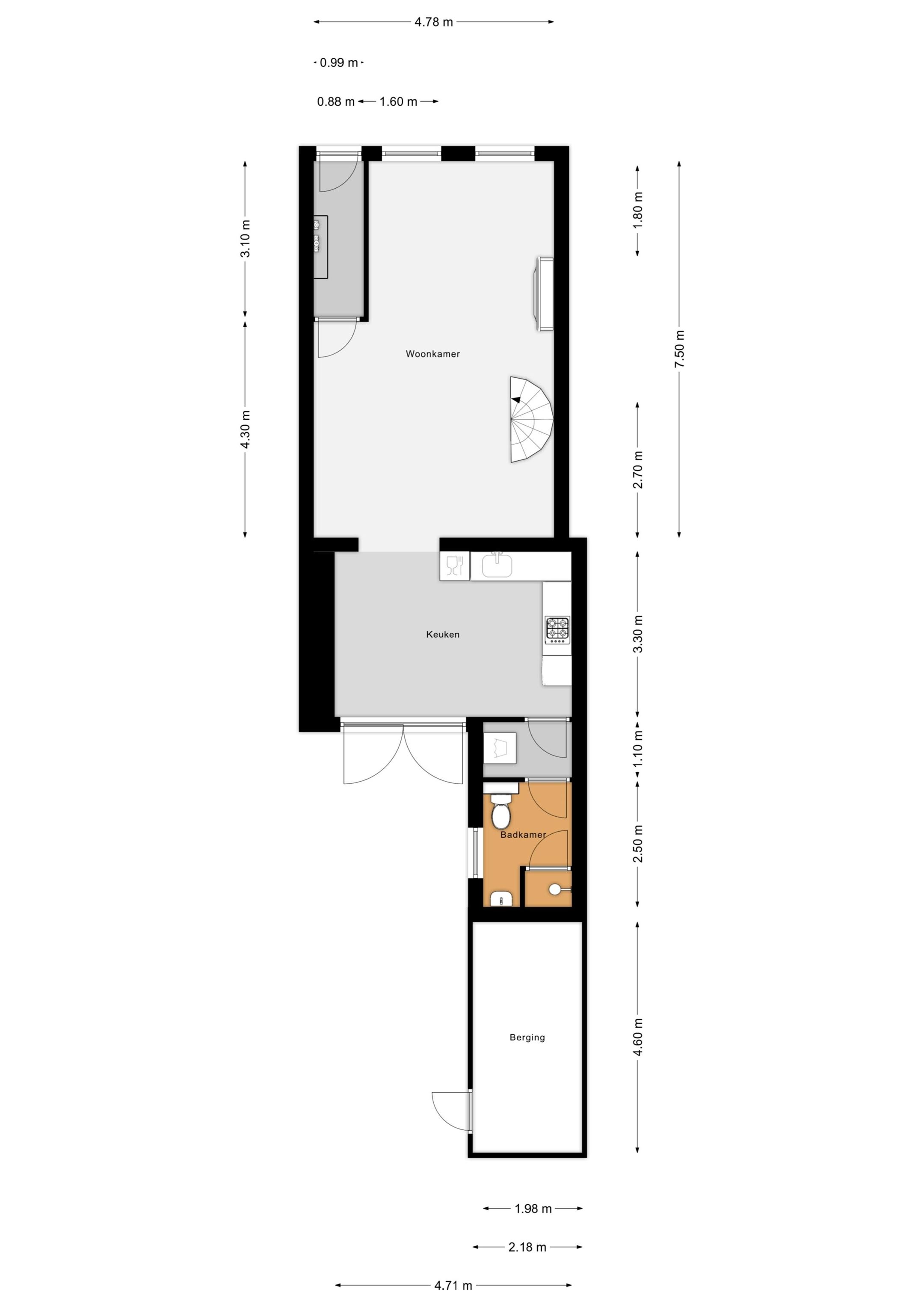 Via de lichte hal voorzien van mooi weggewerkte meterkast en sfeervolle verlichting bereik je de woonkamer. Wat je meteen zal opvallen is de sfeer die de huiskamer met openhaard uitstraalt en de ruimte !! Het hoge plafond werkt hier zeker aan mee. De vloer is voorzien van een wit geschilderde laminaatvloer. Via de huiskamer bereik je de nette semi-open keuken die van alle gemakken is voorzien. In de keuken is ook genoeg ruimte voor een flinke eetkamertafel. Vanuit de keuken bereik je de badkamer, die is voorzien van een douche, zwevend toilet, wastafel en radiator. Tussen de keuken en badkamer is een afgesloten ruimte die geschikt is voor de wasmachine en eventueel wasdroger. Achter de woning kun je de nette betegelde plaats met achterom en ruime stenen berging bereiken via de openslaande tuindeuren. De achterom is zeer breed, dus ook geschikt voor een motor.