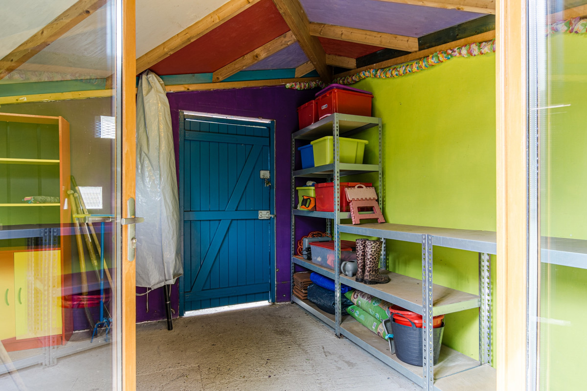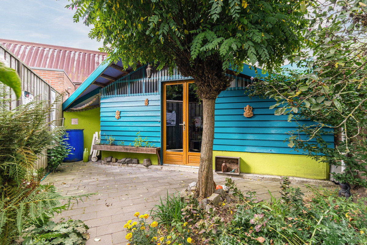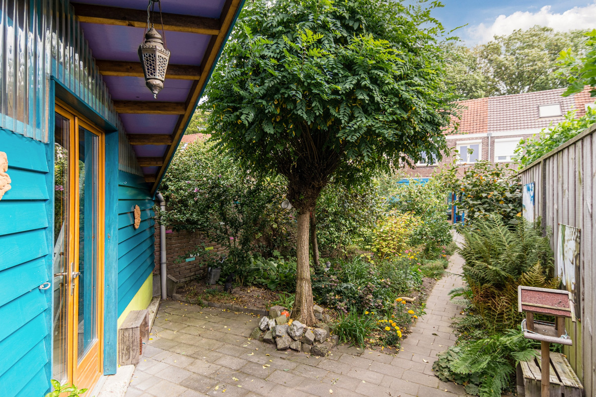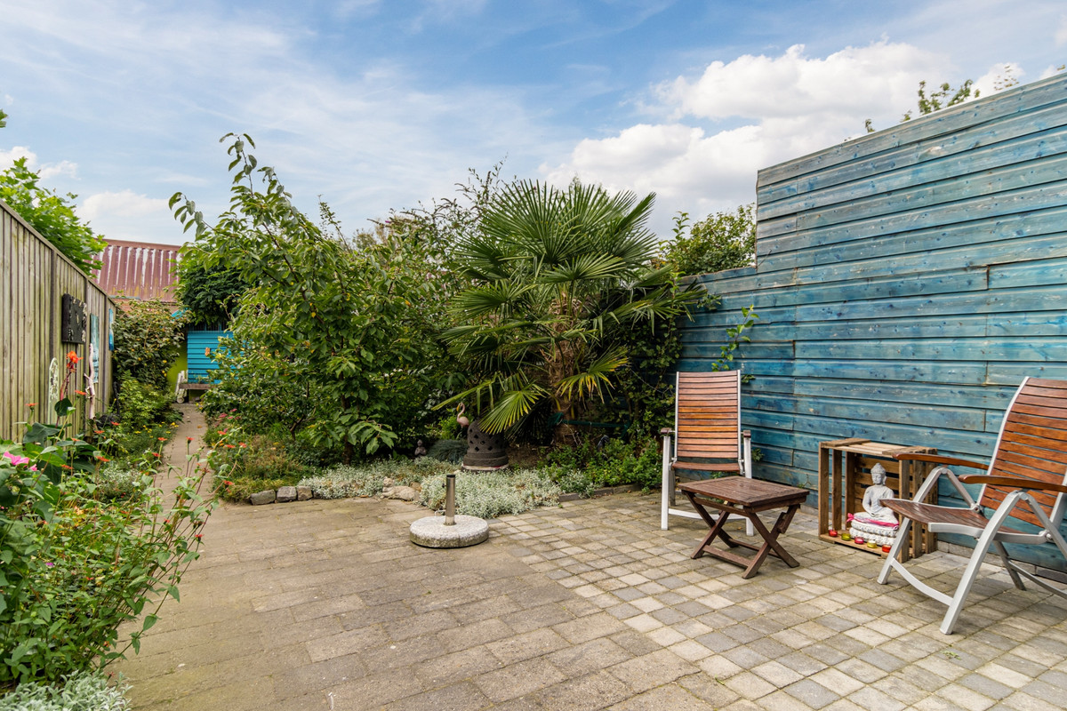 Diepe en royale achtertuin (20 meter), gelegen op het zuidwesten, dus zon tot in de late avonduren. De tuin is voorzien van sierbestrating, heel veel groen en een grote, vrijstaande houten berging met elektra en achterom.