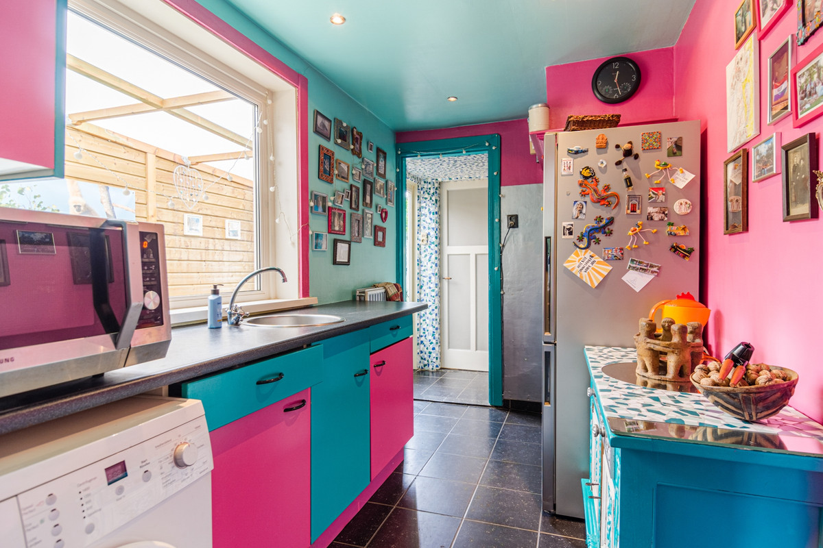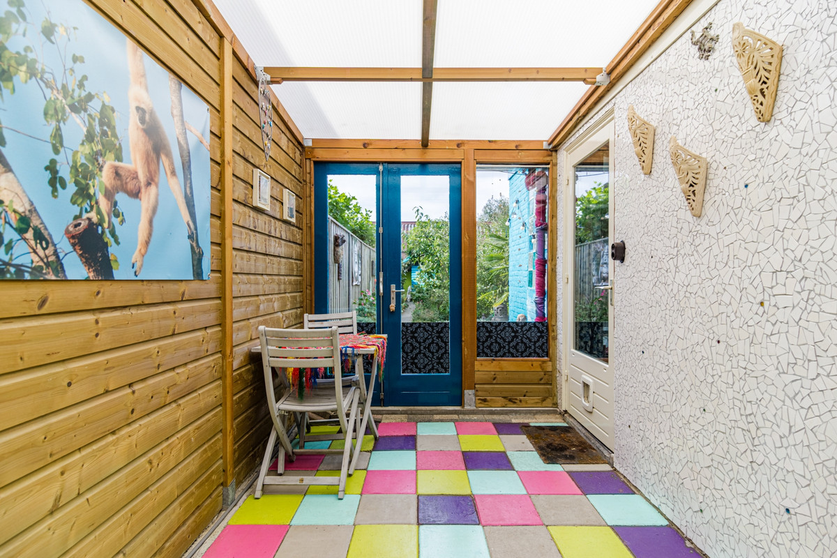 Fraaie gang/entree met mooie authentieke tegelvloer, trapopgang met daaronder de trapkast met meterkast en toegang tot de fleurige woonkamer in L-vorm met laminaat vloer. Aansluitend via de uitbouw toegang tot de keuken met tegelvloer en eenvoudig keukenblok, gaskookplaat met afzuigschouw. Via het portaal met tegelvloer toegang tot het speelse toilet en de sfeervolle badkamer met ligbad, wastafel en verwarming. Via de betegelde serre met openslaande tuindeuren bereik je de gigantische groene achtertuin met achterom. De tuin heeft de ligging op het zuidwesten en is voorzien van een grote houten berging.