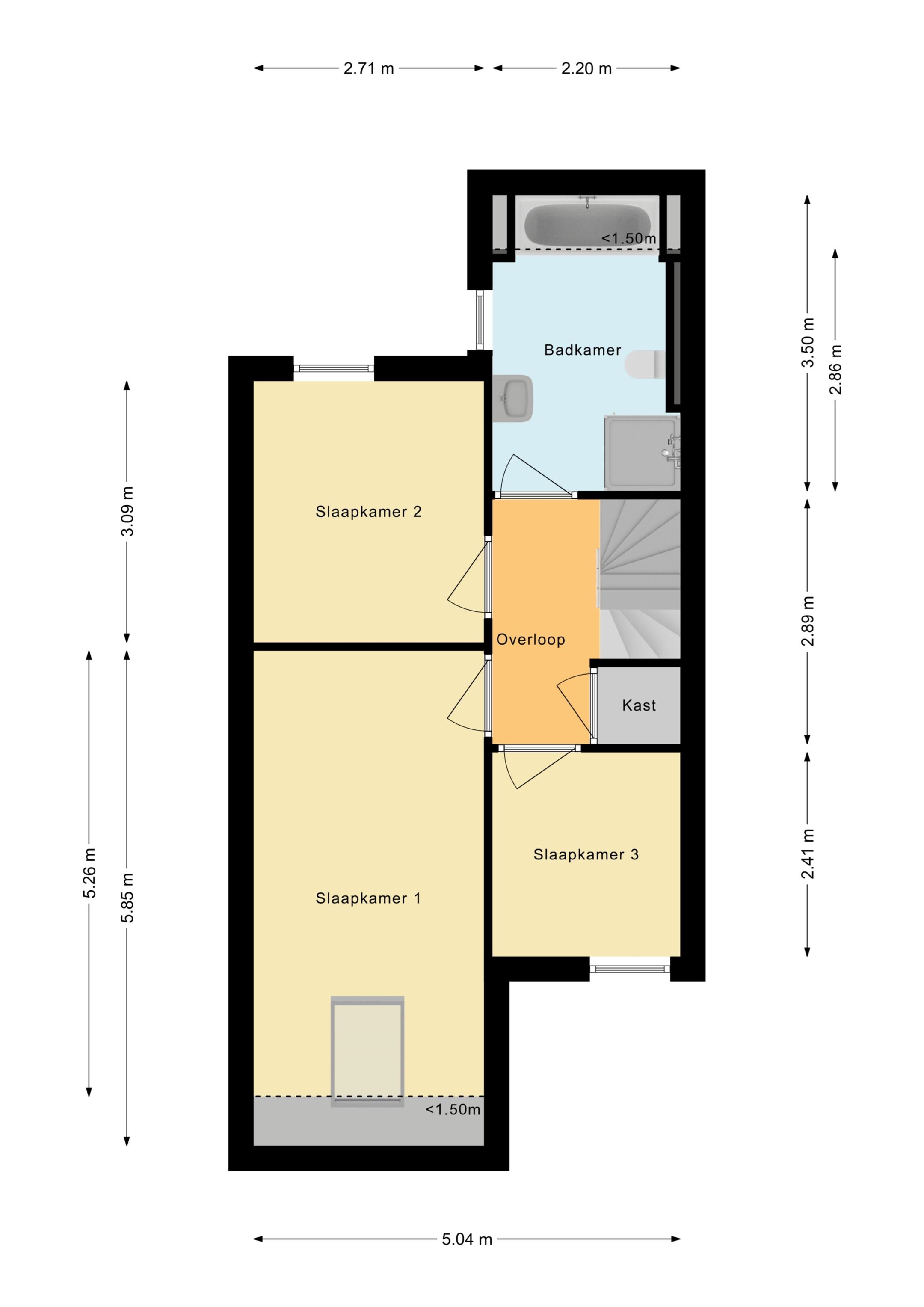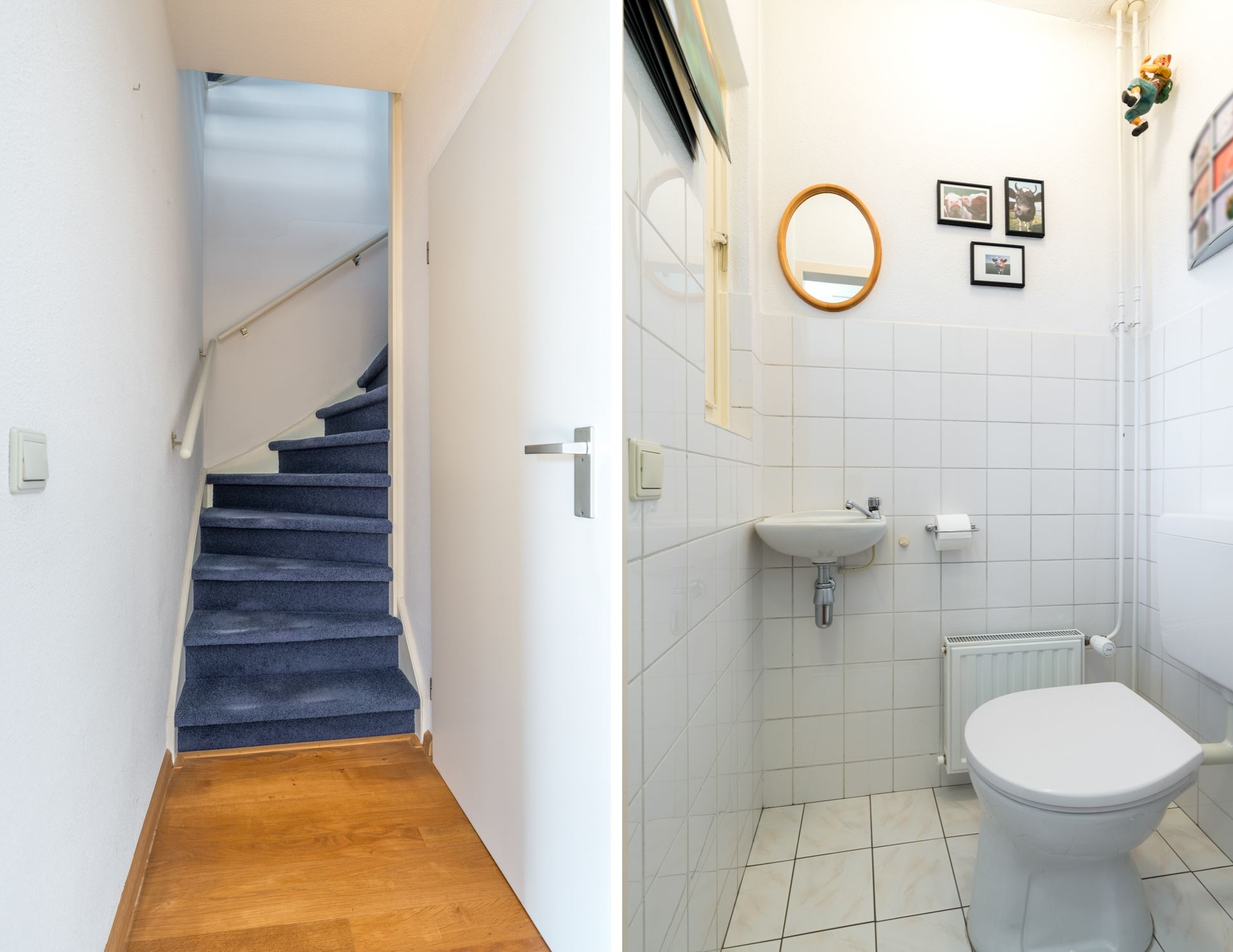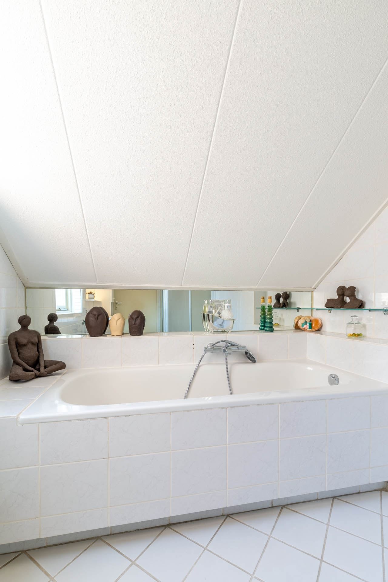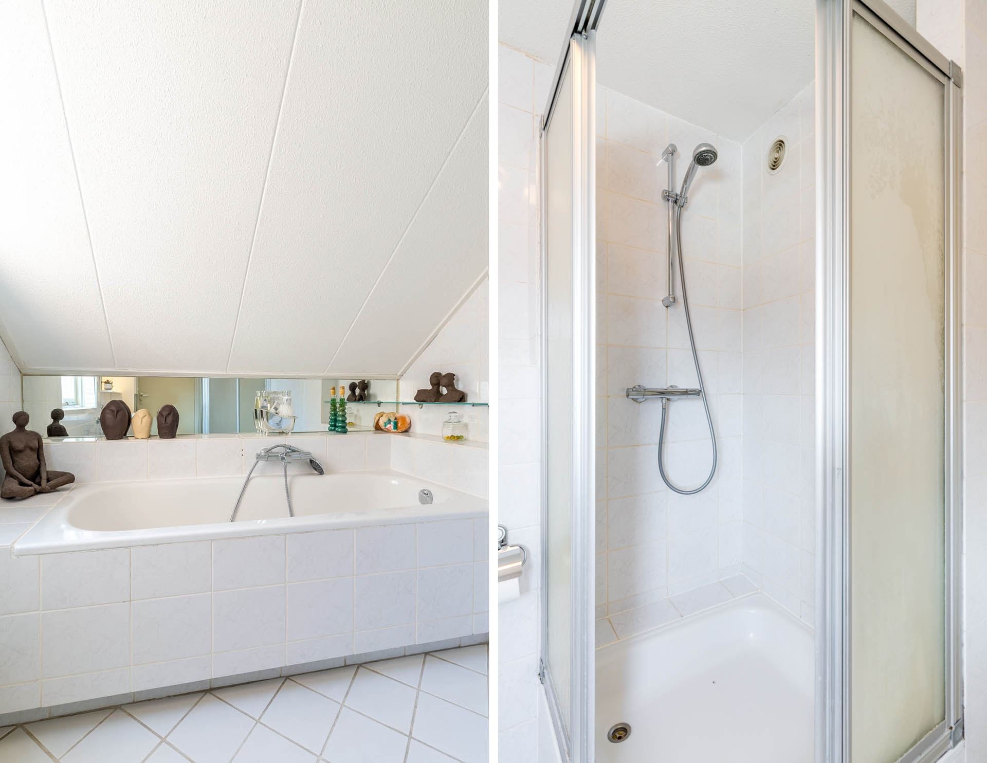Via een trap in de huiskamer kom je op de eerste verdieping met drie slaapkamers en de badkamer met douche, ligbad, wastafel en toilet.